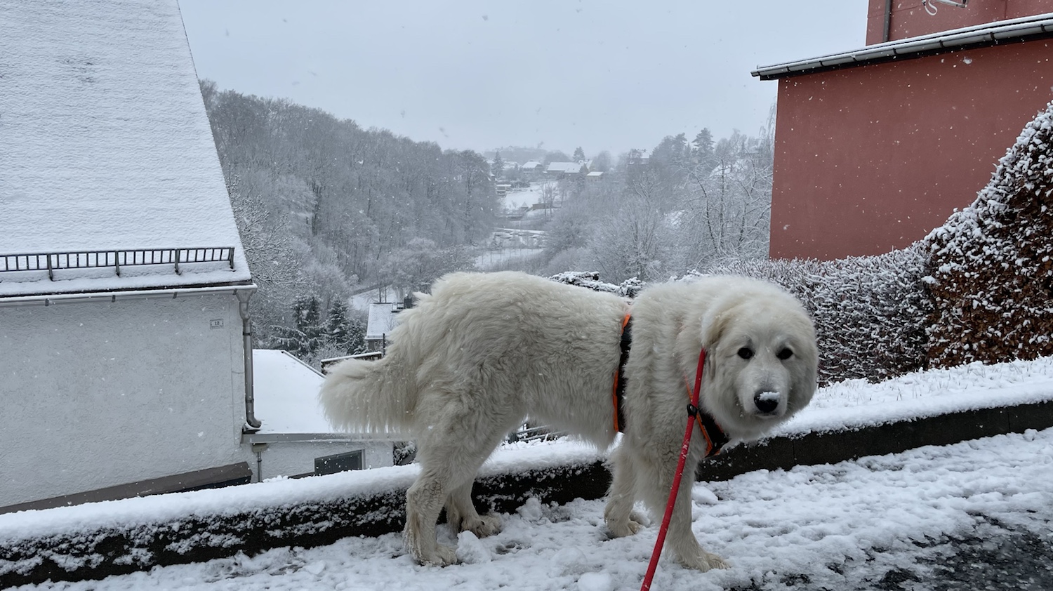 Dann sind wir raus in meinen Garten. In der Nacht hat es geschneet. Deshalb hat es im Dunkelfinsteren auch gekratzt. Aber das ist kein schöner Schnee. Ganz matschepampig. Mein großer Mensch hat gleich noch die Wege freigekratzt. Ich bin an meinen Pool gegangen. Da habe ich dann auf meinen großen Mensch und meinen Sonntagsspaziergang gewartet.