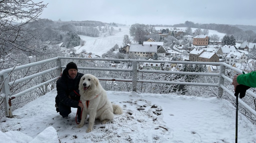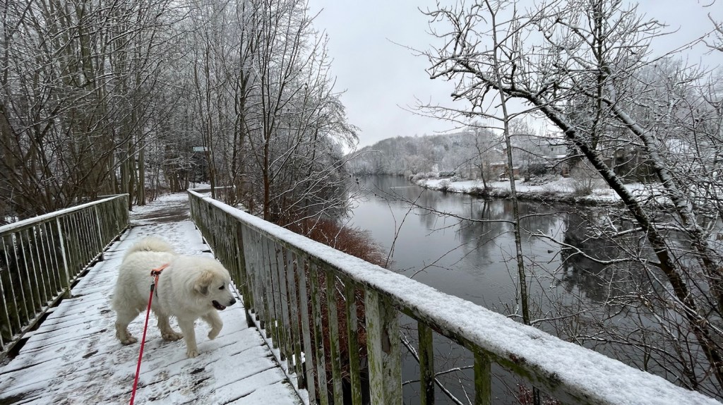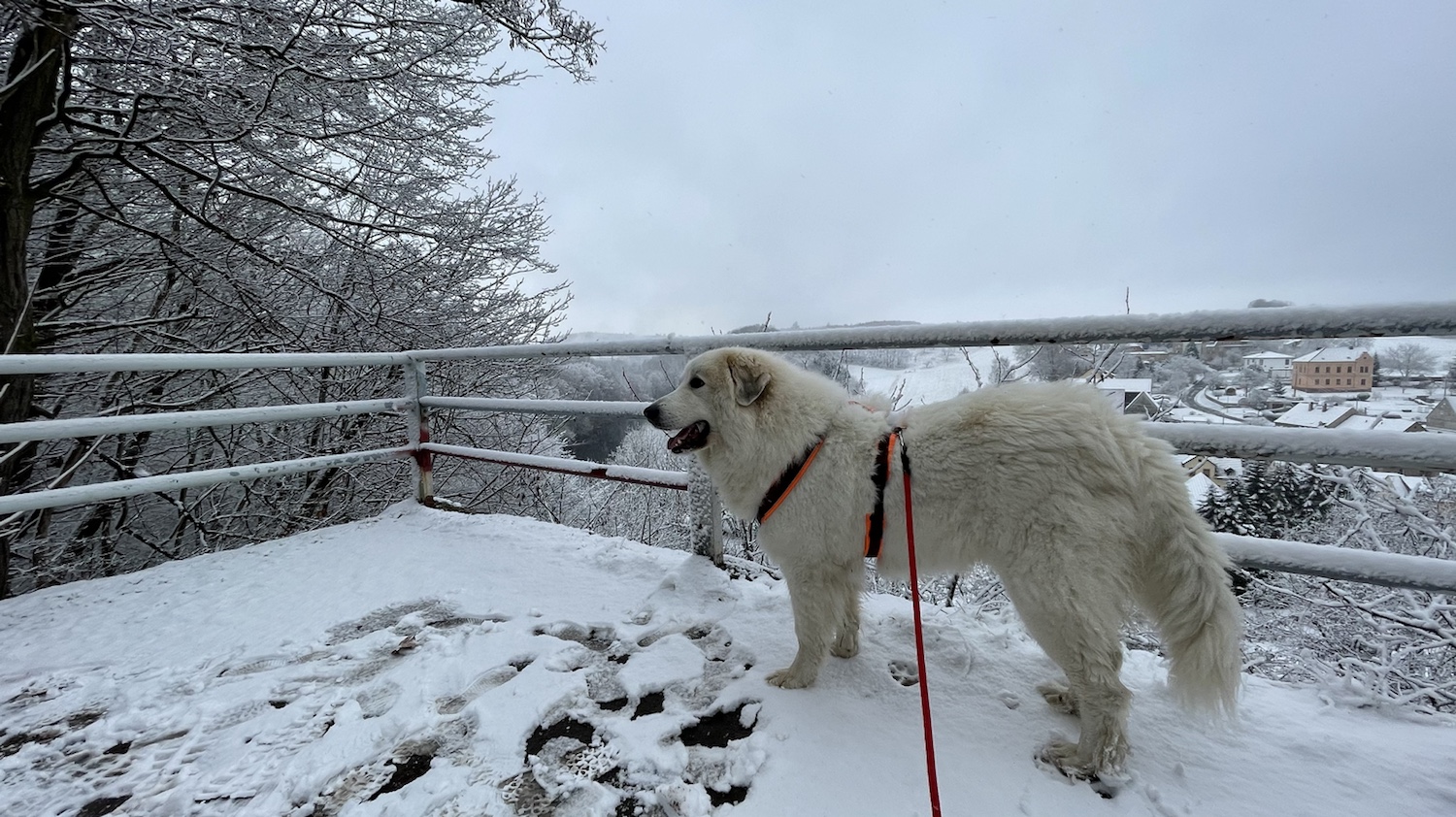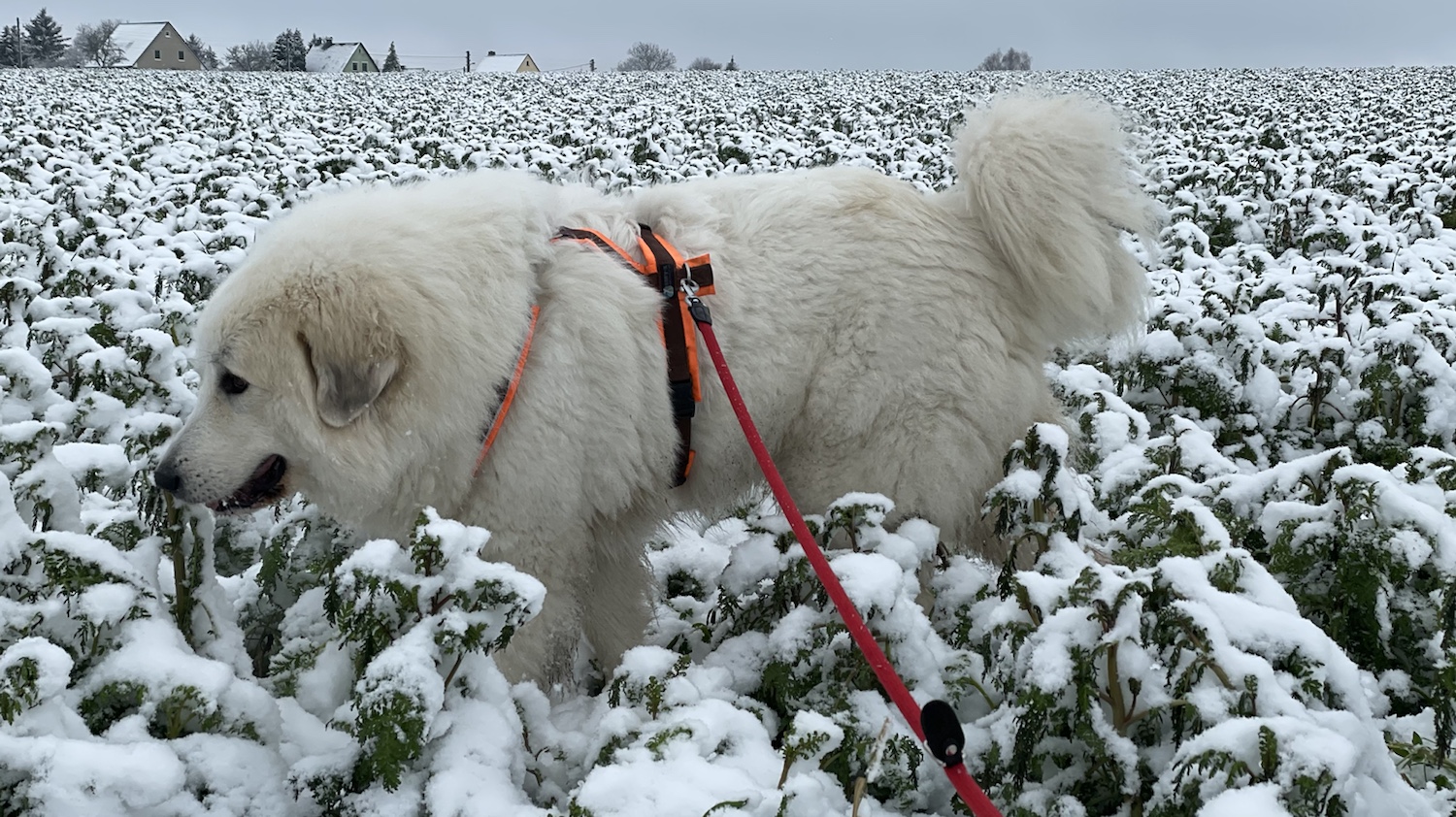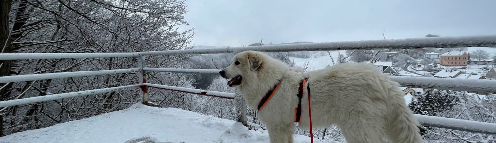 Dann sind wir losgelaufen. Mein großer Mensch und ich, seine Bella. Wir sind heute zum Stadtpark gegangen. Da waren wir ganz lange nicht. Ich glaube, zuletzt voriges Jahr. Auf dem Weg dahin haben wir zwei vorlaute kleine Hunde getroffen. Die haben schon ganz wild geschimpft, da haben wir die noch gar nicht gesehen. Aber dann habe ich die gesehen. Die waren zusammen nicht mal halb so groß wie ich aber haben ein Spektakel gemacht … Da wollte ich natürlich hin und für Ruhe sorgen. Und da bin ich losgerannt. Es ging den vollgeschneiten Weg runter. Mein großer Mensch hing hinten an meiner Führleine dran. Erst an der großen Straße hat er mich mit Hilfe des Straßengeländers gestoppt. Da hatten die zwei Krawallzwege aber Glück.