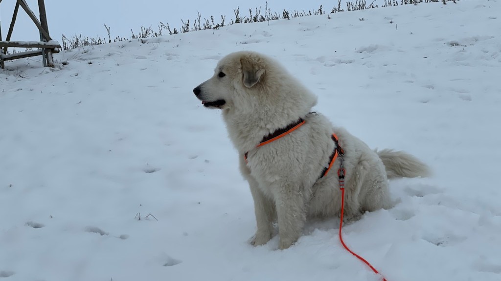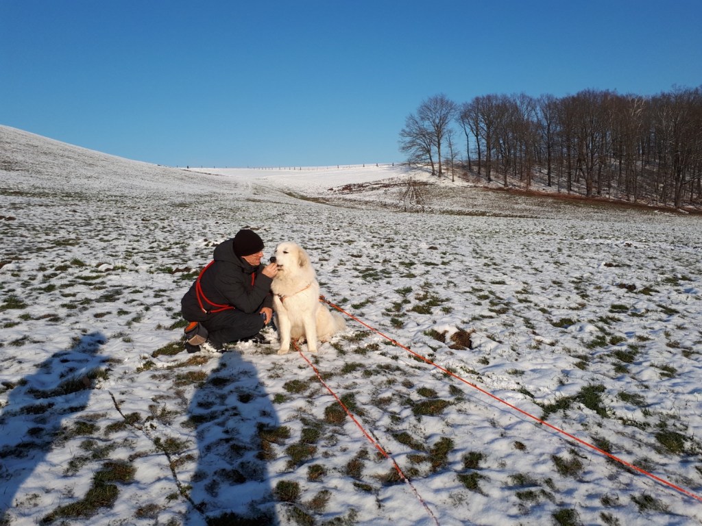Dann sind wir zum Skihang gelaufen. Über die große Wiese am Feldrand. Und da habe ich mich erstmal schön im Schnee gewälzt. Dann haben wir eine kleine Picknickpause und ein Photoschießen gemacht. Aber vorher habe ich mich nochmal gewälzt. Im Schnee. Der ist weiß. Aber nicht so schön champagnercremeweißfarben wie das Pyrifell von der Bella.