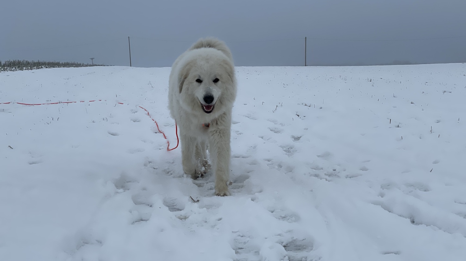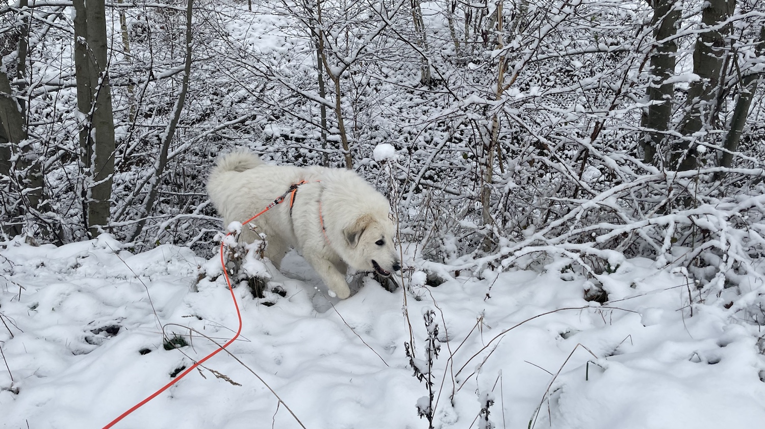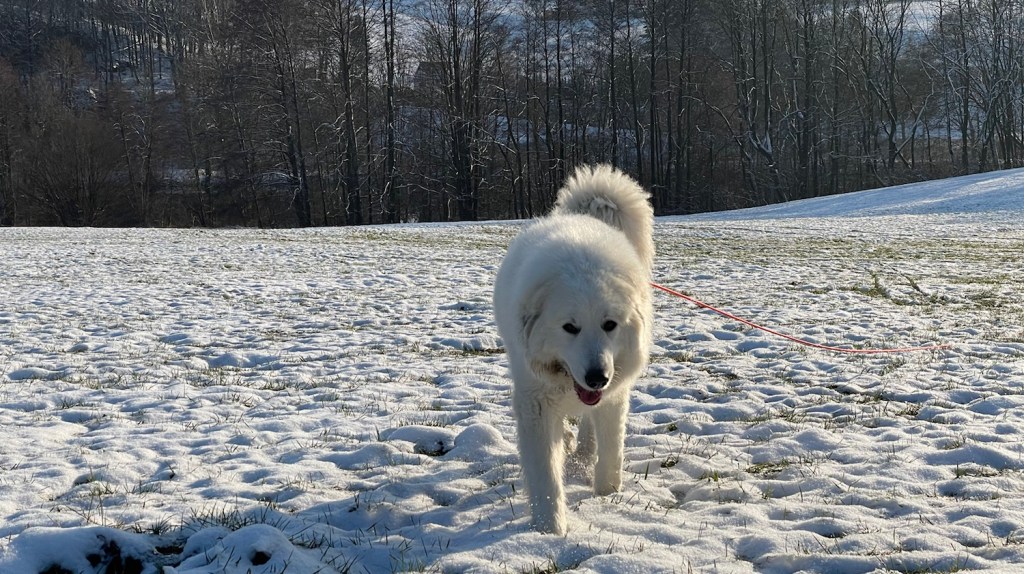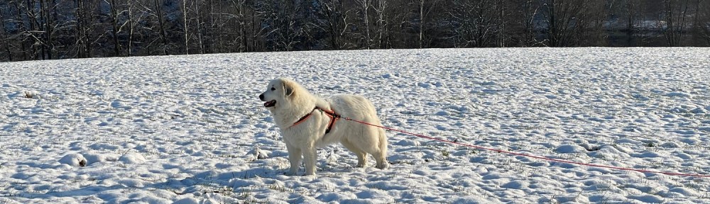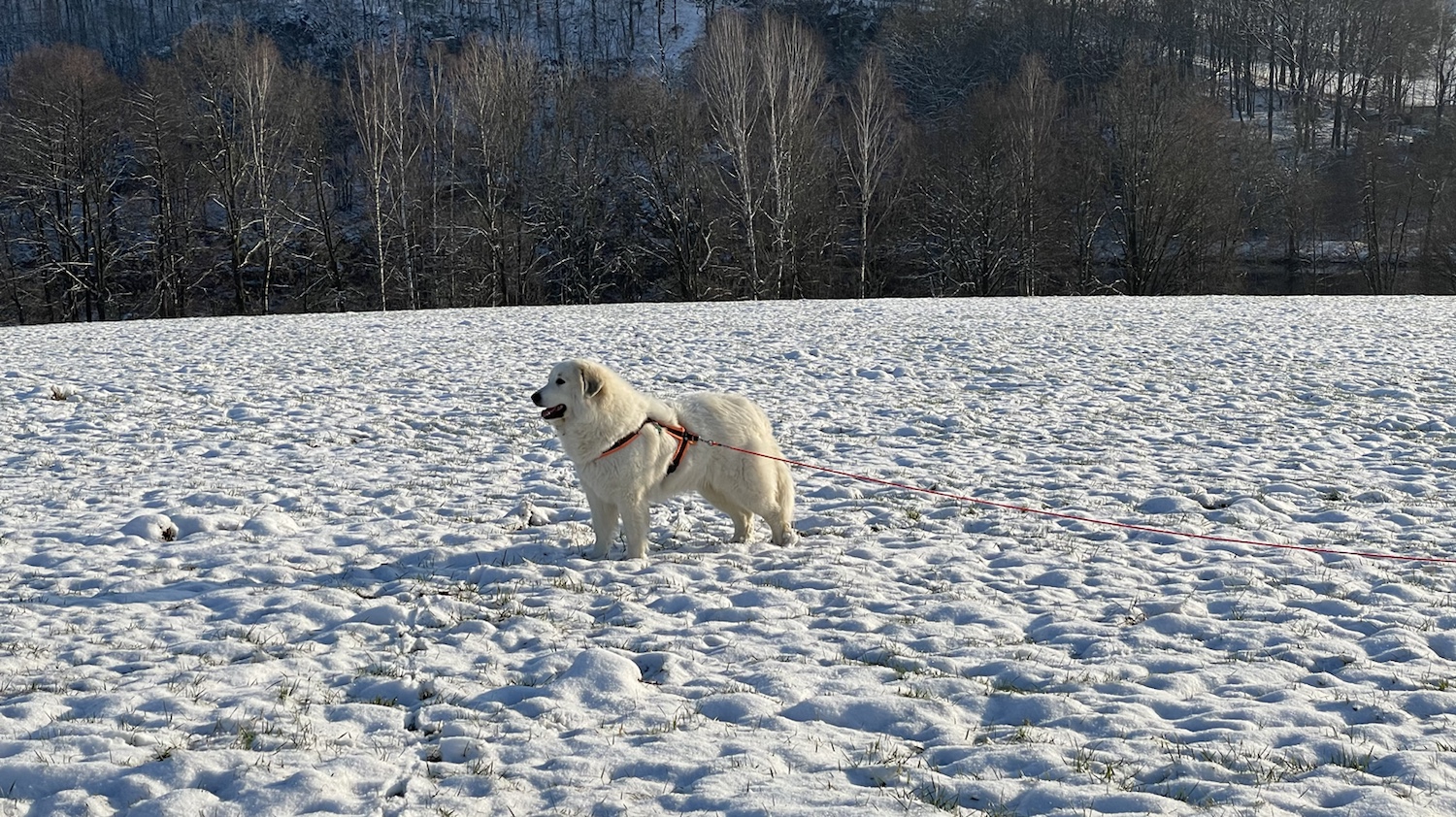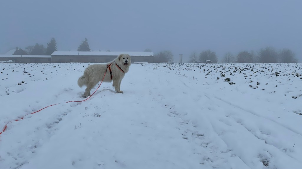 Deshalb sind wir gleich weiter über das große Feld. Ich durfte wieder überall im Schnee schnuffeln. Wir sind über den Feldweg zwischen den Feldern bis zur kleinen Straße gegangen und da haben wir heute die Rehe gesehen. Zwei Stück. Und die haben uns beobachtet und sind nicht fortgelaufen. Weiiil, die Bella ist eine ganz liebe Pyri. Da muß man sich nicht fürchten.