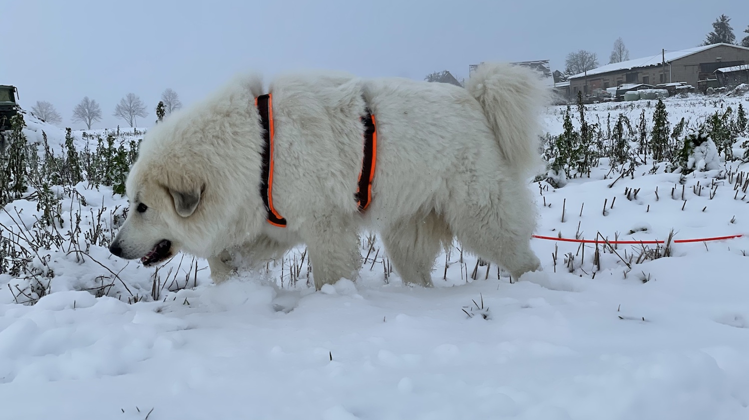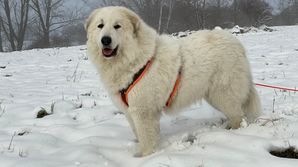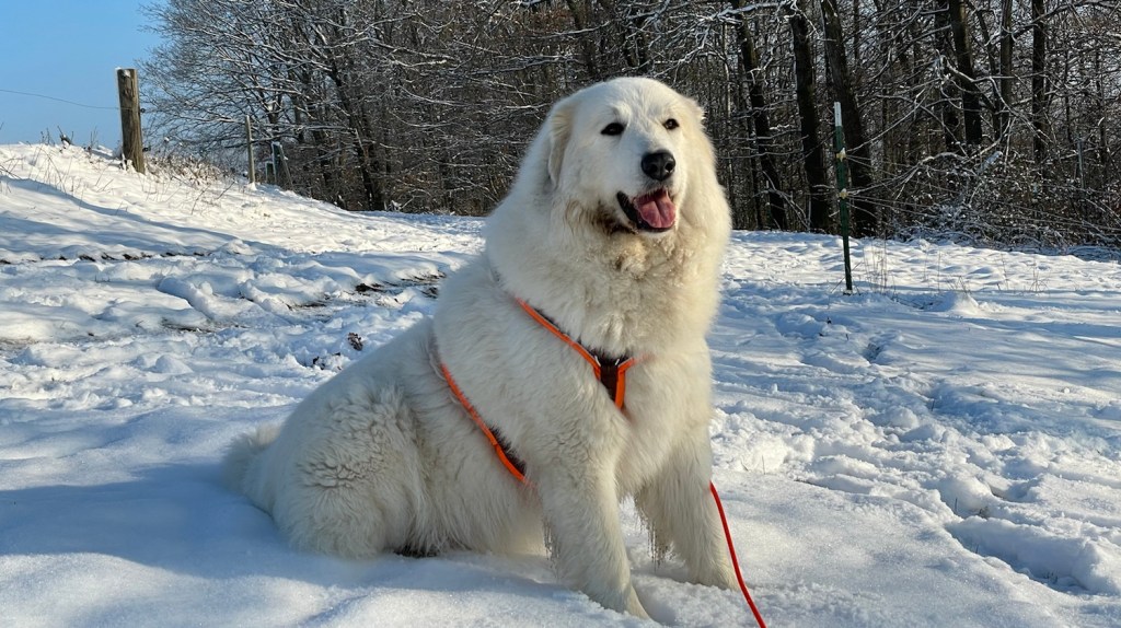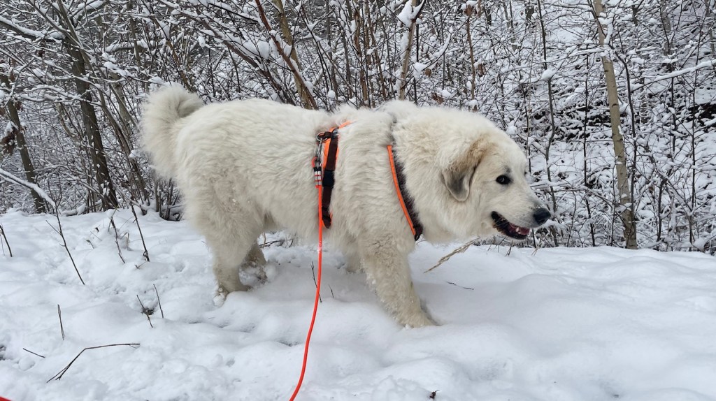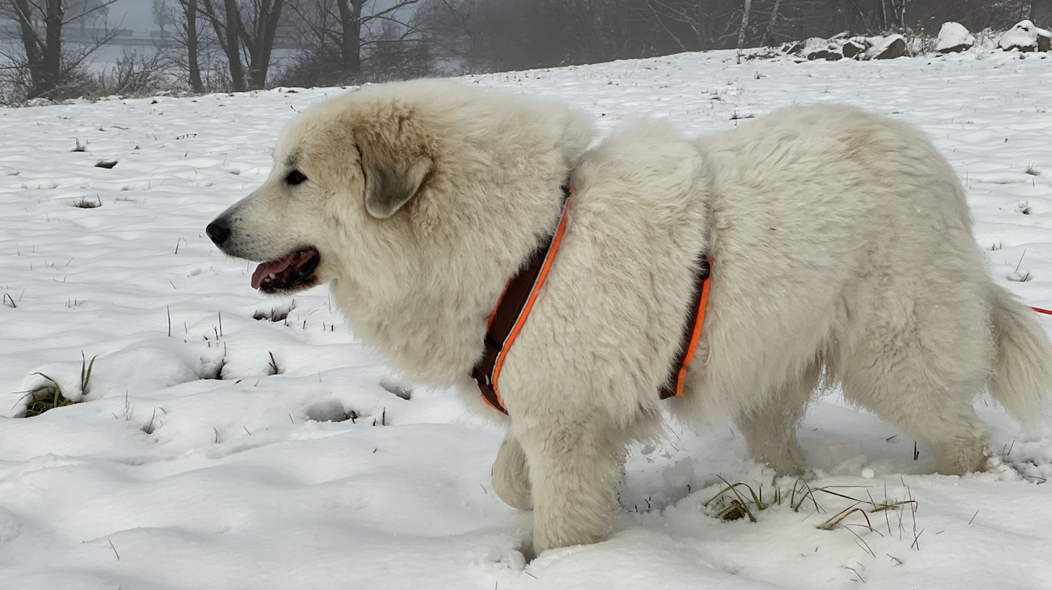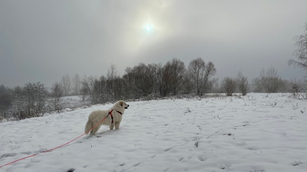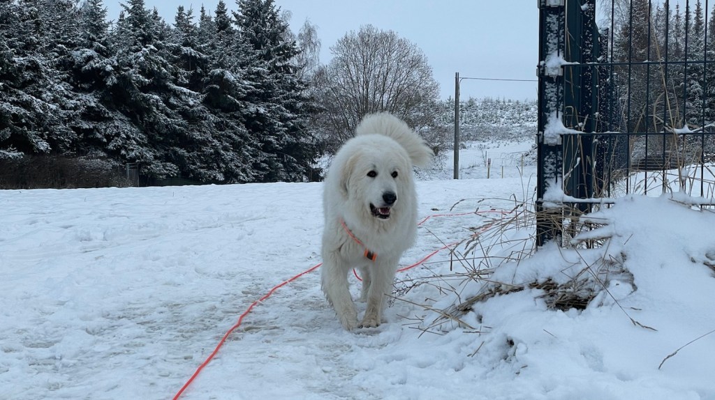 Deshalb sind wir gleich weiter über das große Feld. Ich durfte wieder überall im Schnee schnuffeln. Wir sind über den Feldweg zwischen den Feldern bis zur kleinen Straße gegangen und da haben wir heute die Rehe gesehen. Zwei Stück. Und die haben uns beobachtet und sind nicht fortgelaufen. Weiiil, die Bella ist eine ganz liebe Pyri. Da muß man sich nicht fürchten.