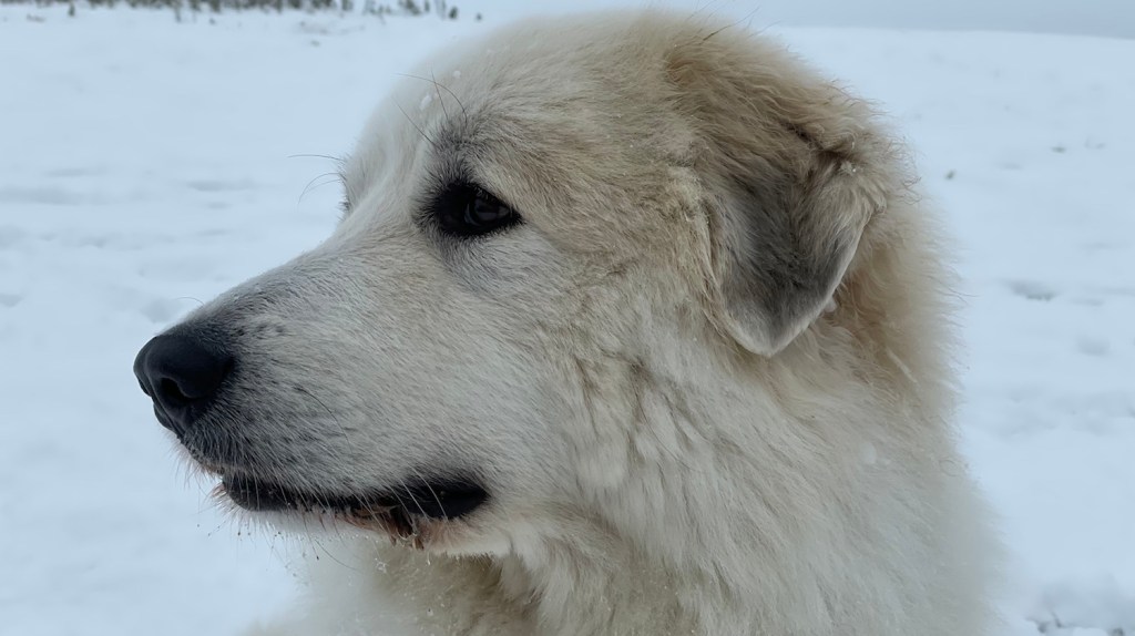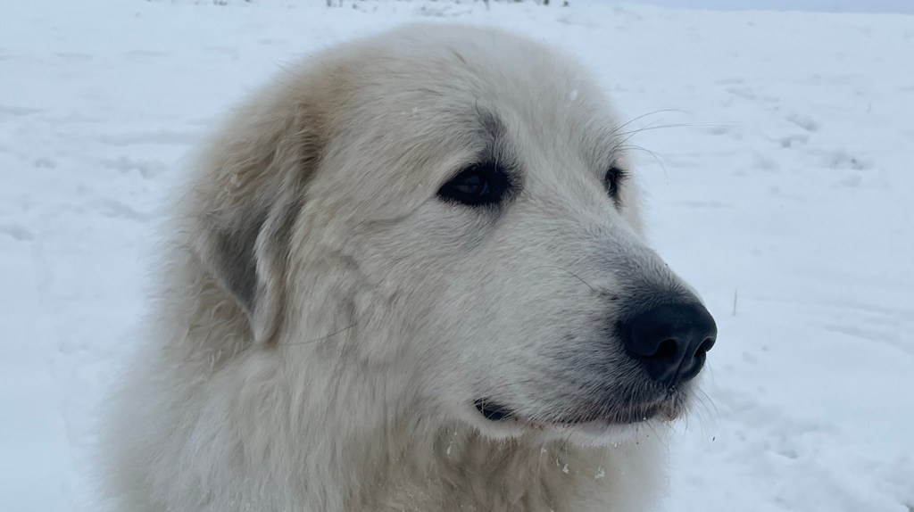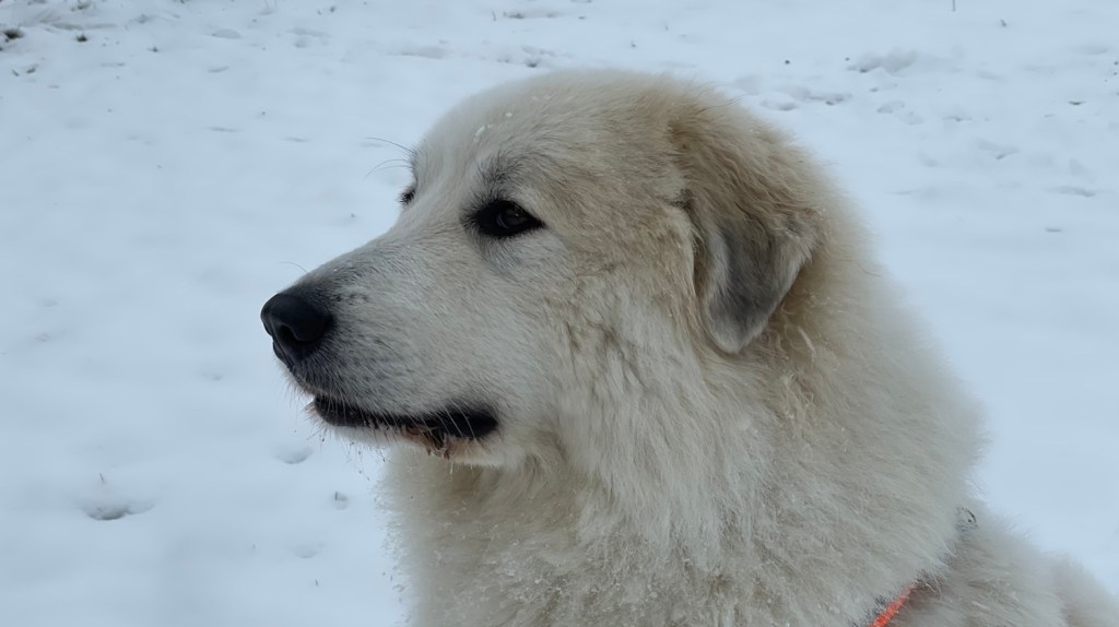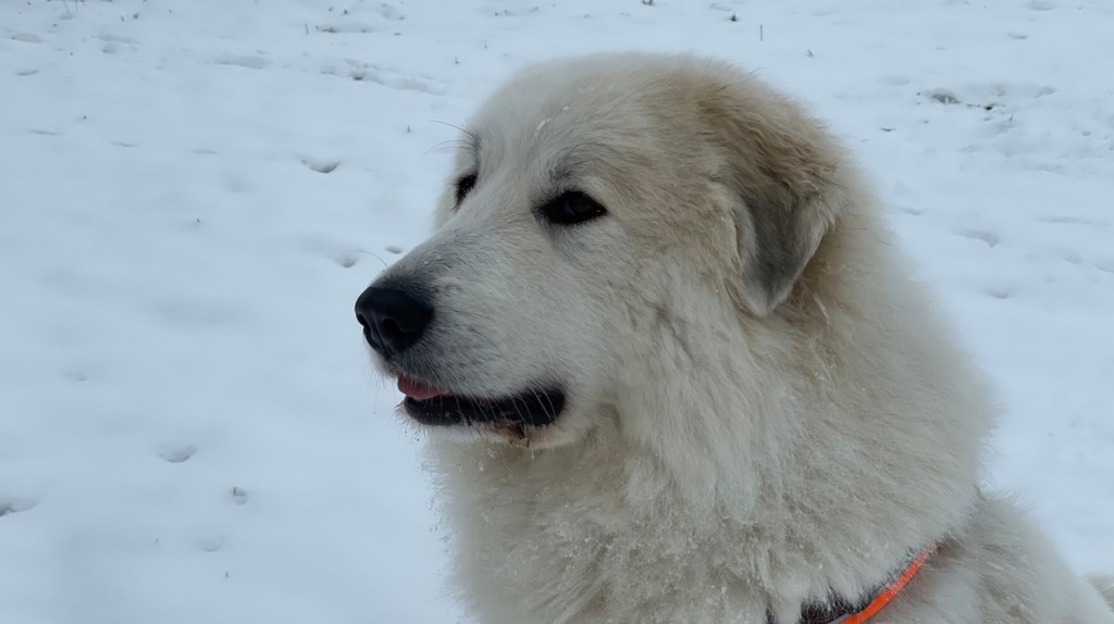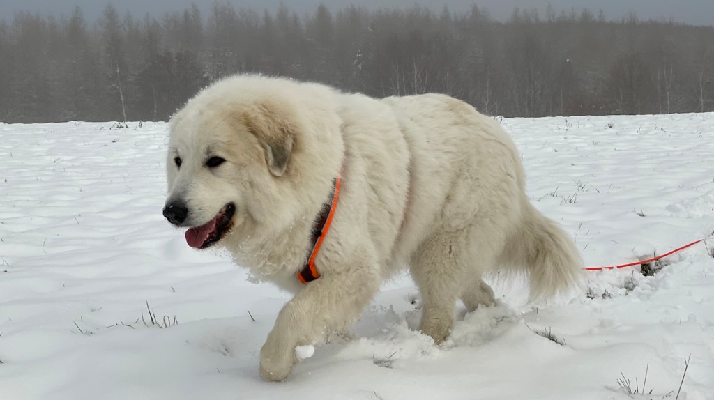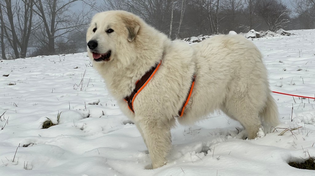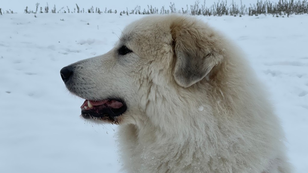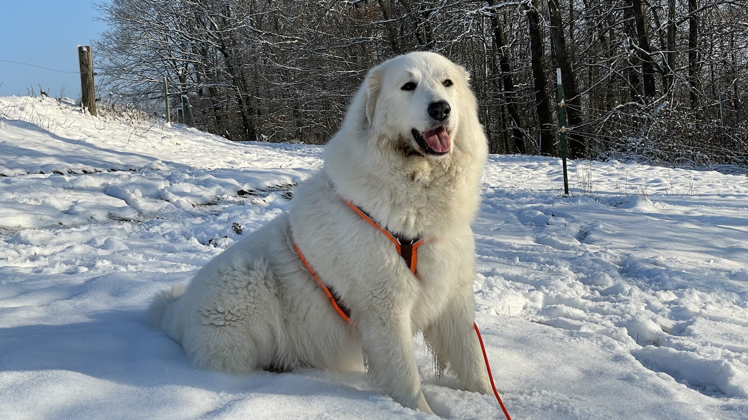 Deshalb sind wir gleich weiter über das große Feld. Ich durfte wieder überall im Schnee schnuffeln. Wir sind über den Feldweg zwischen den Feldern bis zur kleinen Straße gegangen und da haben wir heute die Rehe gesehen. Zwei Stück. Und die haben uns beobachtet und sind nicht fortgelaufen. Weiiil, die Bella ist eine ganz liebe Pyri. Da muß man sich nicht fürchten.