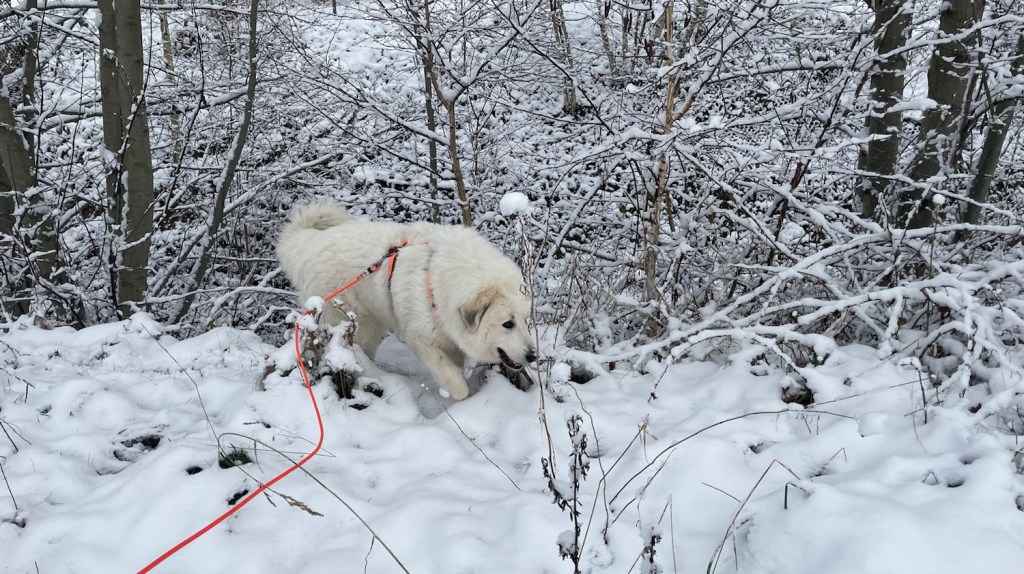 Und auf meiner großen Feldwiese waren auch Menschen. Mit Hund. Aber ich habe geschnuffelt. Im Schnee. Das war nämlich schön. Und wir sind zur großen Wiese gegangen. Und dort sind auch ganzganz viele Menschen gewesen. Ich habe aber erstmal ganz aufmerksam zum kleinen Birkenwäldchen an der Rehwiese geguckt. Und dann war es da. Das Reh. Und es ist fortgelaufen. Und ich hinterher. Aber am anderen Ende von meiner Feldleine hing ja noch mein großer Mensch. Und da bin ich hingeklatscht. Ganz schmutzig war ich am Hals und das Reh weg.
