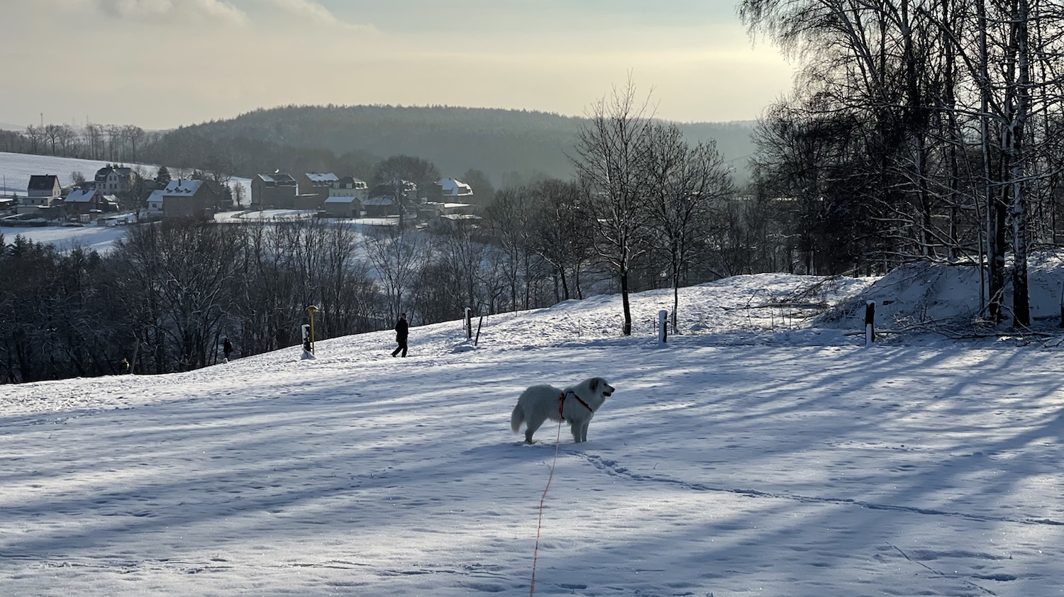 Und als wir weiter zum Skihang gelaufen sind, da kam uns ein Hund entgegen. Ein Chow Chow. In dunklem Braun. Ein Mädchen! Die Schwester vom Johann. Und da haben wir gespielt. Ohne Zickenalarm. Die Schwester heißt Jogo, oder so. Und wir haben ganz lieb gespielt. Die Bella ist doch heute ganz lieb.
