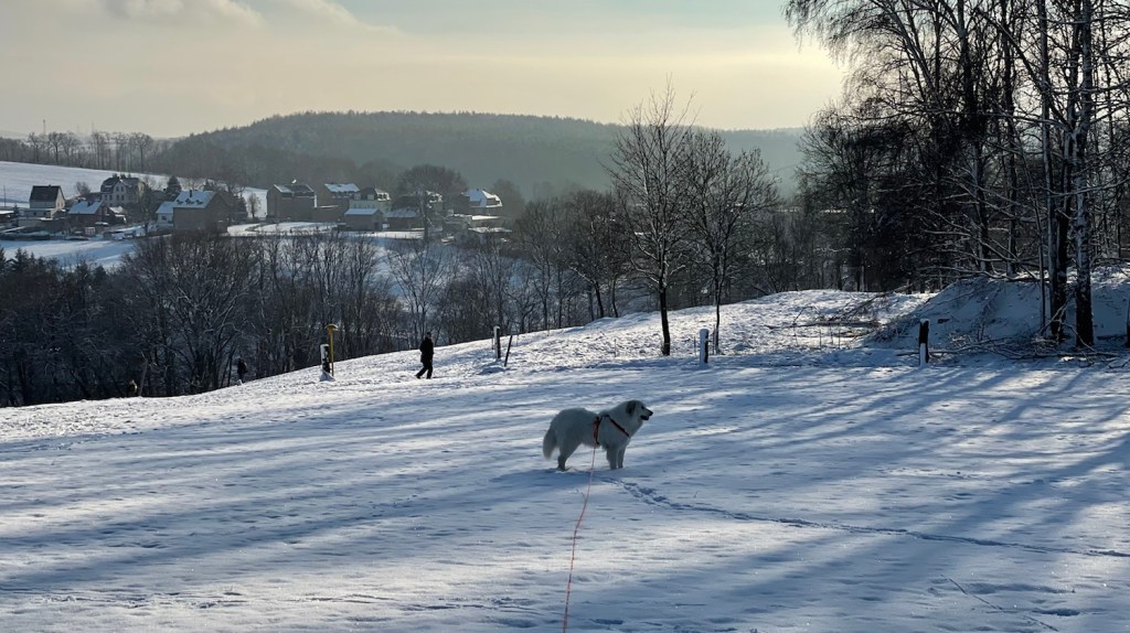Am Skihang waren Menschen. Rodeln, sagt mein großer Mensch. Und ein kleiner Hund war auch da. Aber wir sind sowieso abgebogen. Auf den kleinen Waldweg zurück zum Teich. Diesmal habe ich was getrunken. Da war ein kleines Loch im harten Wasser und da konnte ich trinken.