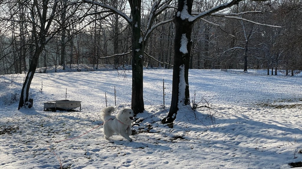 Dann sind wir zur großen Wiese gelaufen. Da war noch schöner Schnee und ich bin gemütlich mit meinem großen Mensch über die ganze große Wiese geschlendert. Ich habe ganz viel geschnuffelt. Dann sind wir an der kleinen Wiese vorbei und zum Teich. Der ist zugefrostet gewesen.