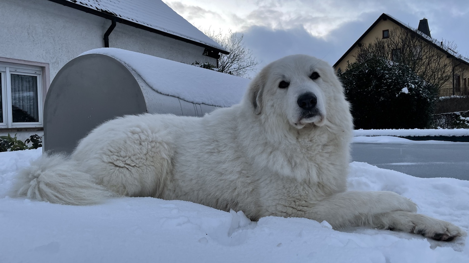 Heute war ziemlich graues Wetter. Ich habe wieder schön meinen Garten bewacht oder bin in meiner Kellerwohnung gewesen, wenn es mir draußen zu viel geschneet hat. Meine Menschen haben immer mal den Schnee von den Wegen weggeputzt.