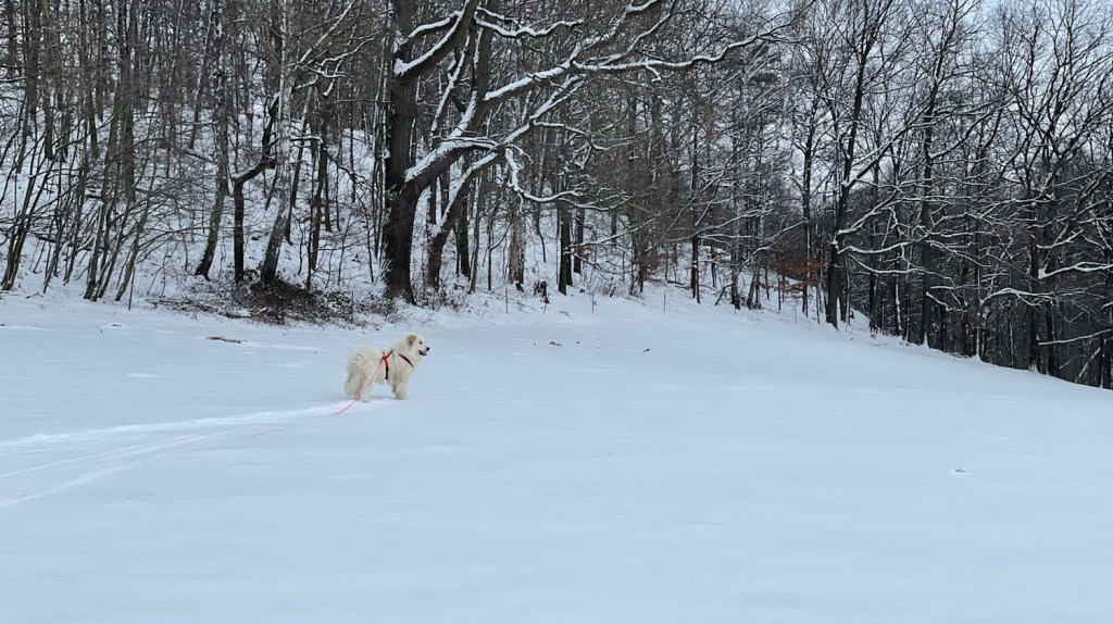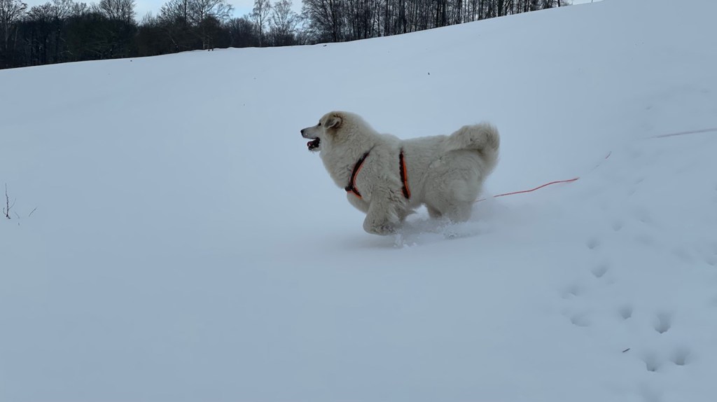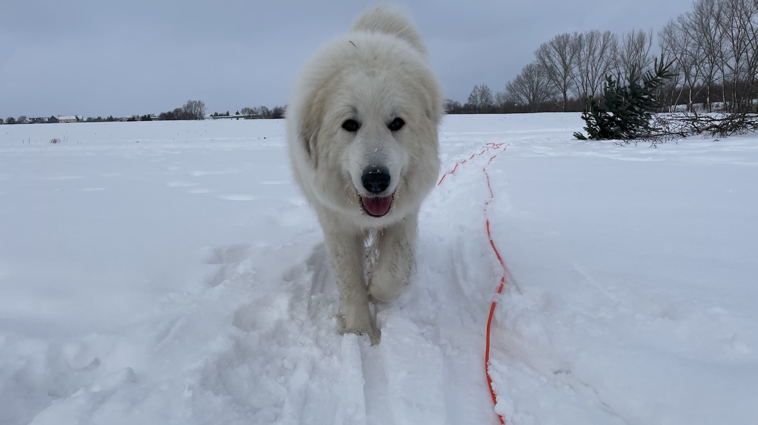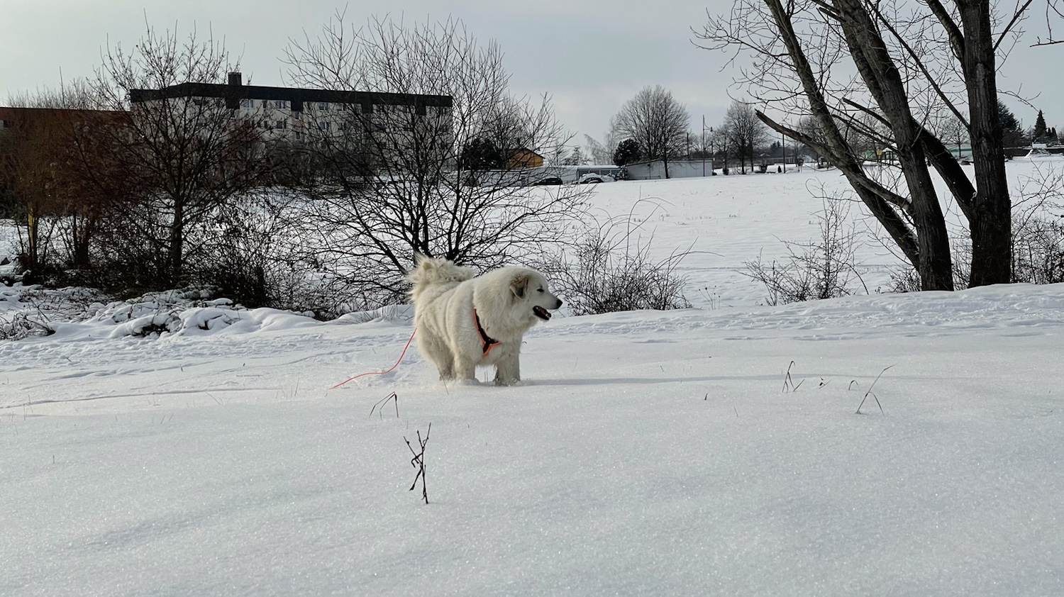 Und dann bin ich mit meinem großen Mensch spazieren gegangen. Zum großen Feldweg. Es war aber graues Wetter. Dafür hat es in der Nacht wieder frischen Schnee geschneet. Und durch den kann die kleine Bella, das bin ich, schön durchhoppeln. Ich bin ganz schnell. Wenn ich will.