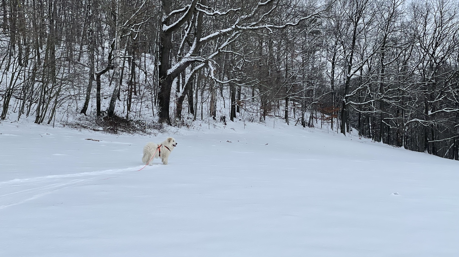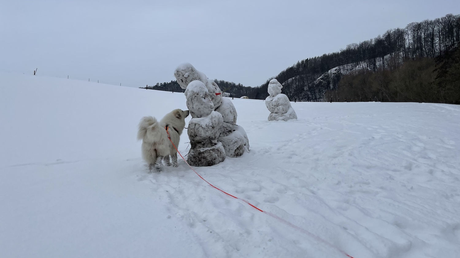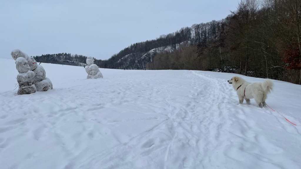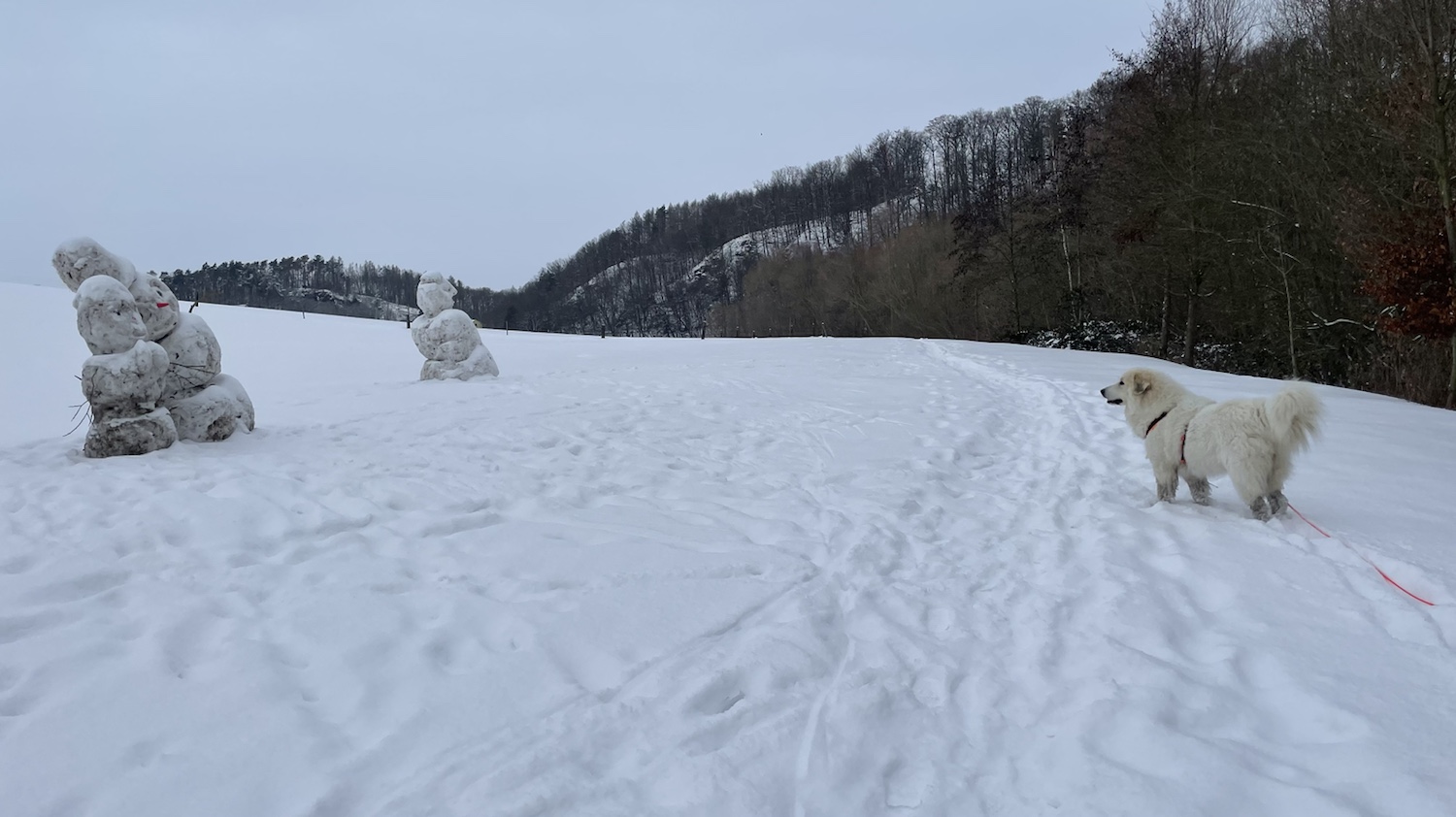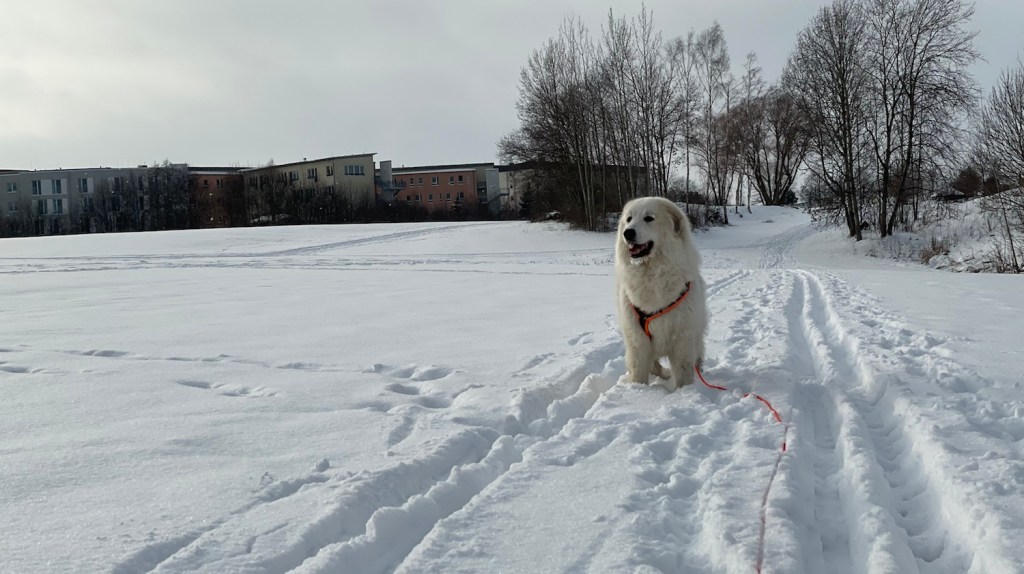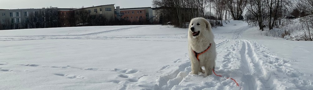 Nachmittags bin ich dann nochmal mit meinem großen Mensch losgewandert. Und da ist meine liebe Sonne mitgegangen. Durch mein Wohngebiet zur großen Wiese hinter meinem Wohngebiet. Wir sind dann von der großen zur kleinen Wiese gegangen. Da ist ganz tiefer Schnee gewesen.