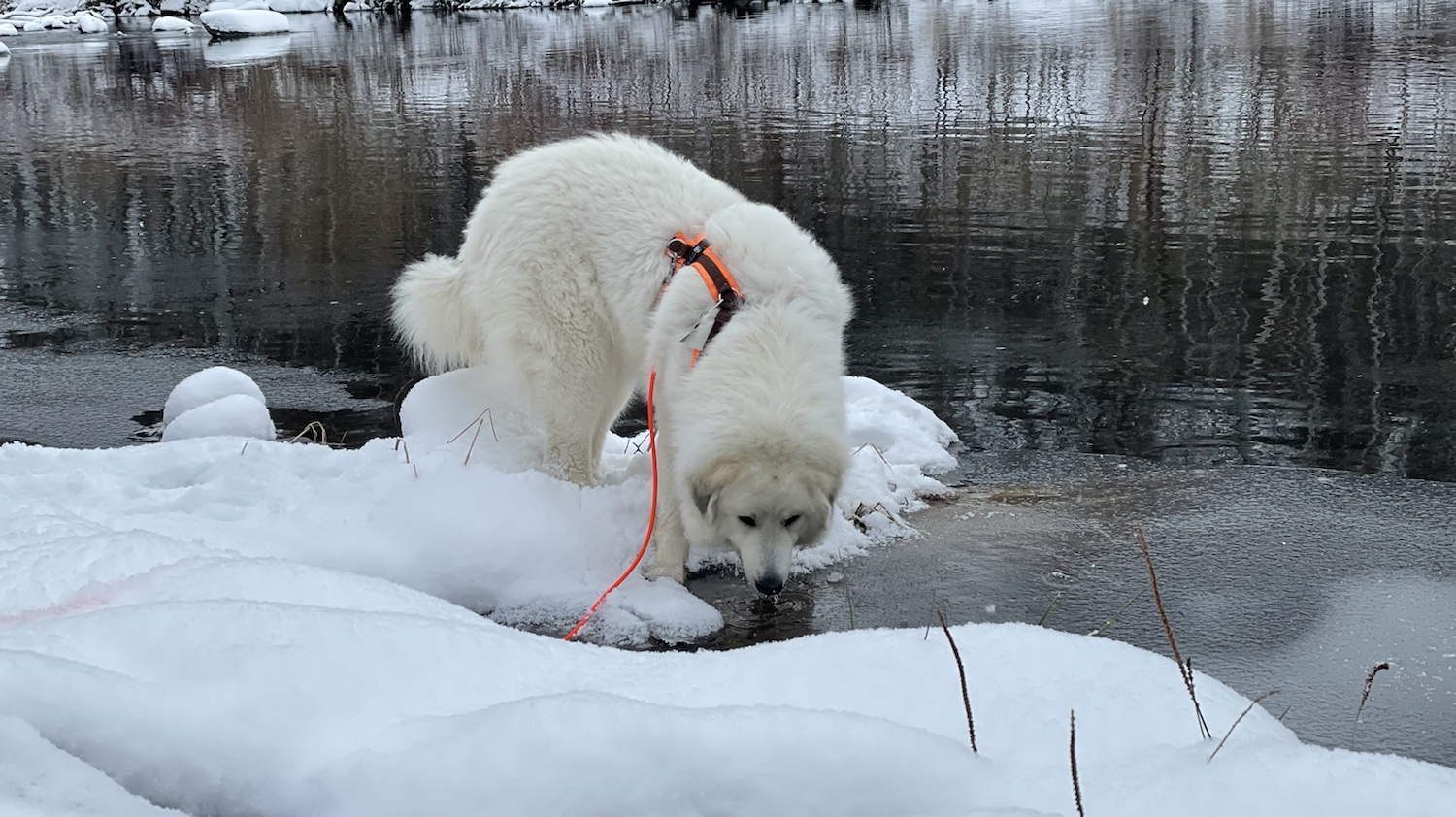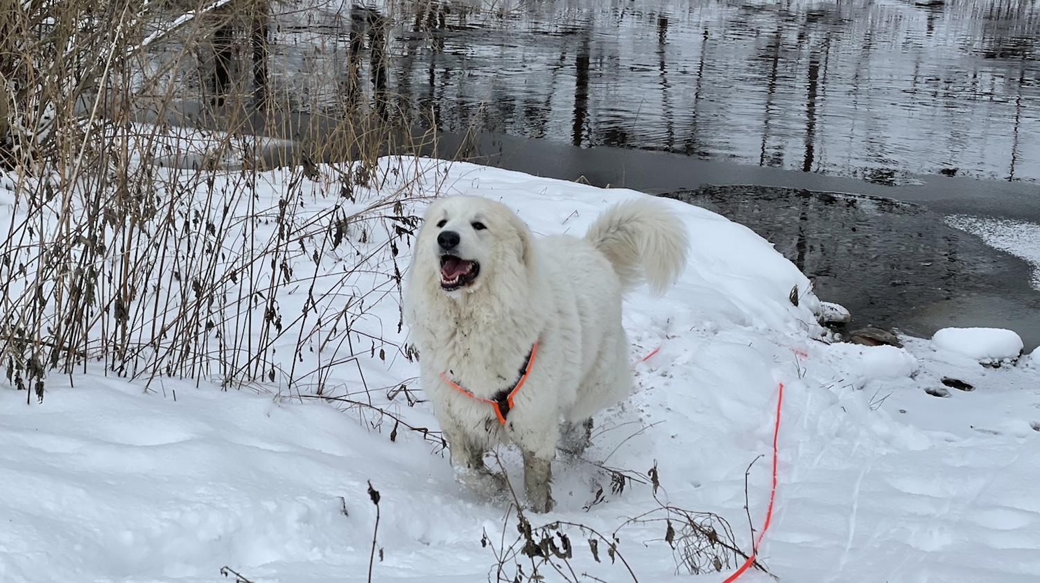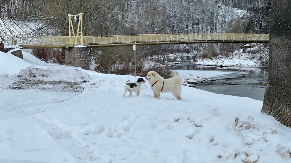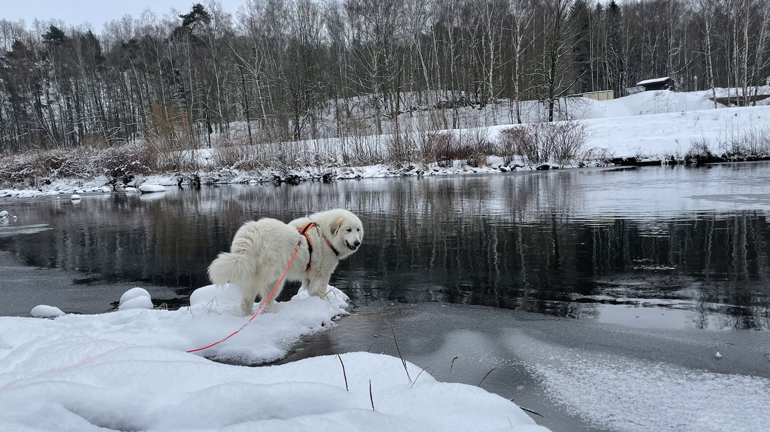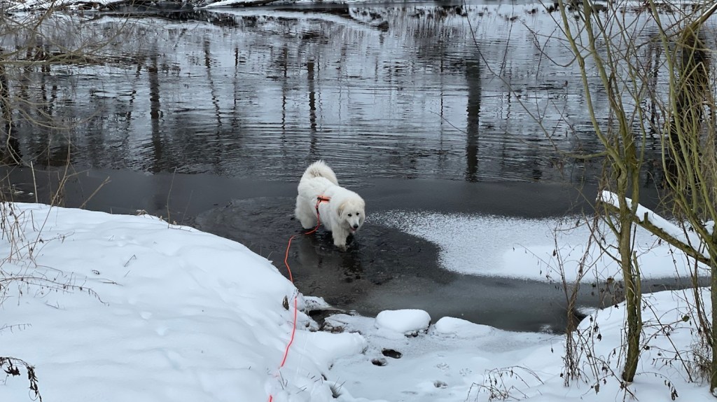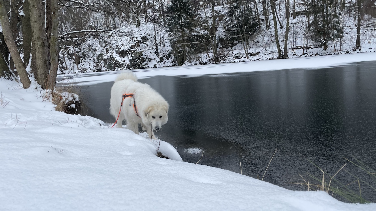 Ich bin dann mit meinem großen Mensch über die große Wiese gelaufen. Bis an den großen Fluß mit dem komischen Namen. Da ist jetzt hartes Wasser drin. Wie in meinem Pool. Zugefrostet ist er, der große Fluß. Mein großer Mensch wollte dann zurück, aber ich bin eine starke Persönlichkeit. Und ich kann gucken.