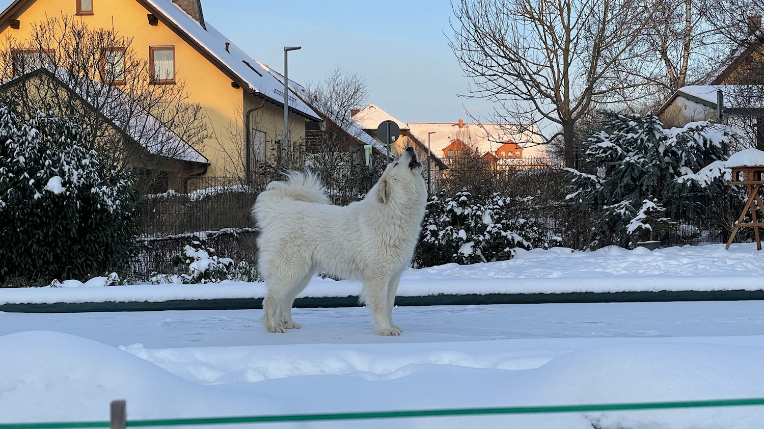 Die Bella hat heute weder schön lange geschlummert. Weiiil, es ist ja ein Wochenende. Nach dem Frühstücksfuttern bin ich gleich raus in meinen Garten. Da hat meine liebe Sonne schon auf mich gewartet. Die war heute nämlich den ganzen Tag da. Und es ist ganzganz kalt gewesen. Ich bin dann gleich auf meinen Pool mit dem harten Wasser und da habe ich die ganze Welt begrüßt und geheult wie eine kleine weiße Wölfin.