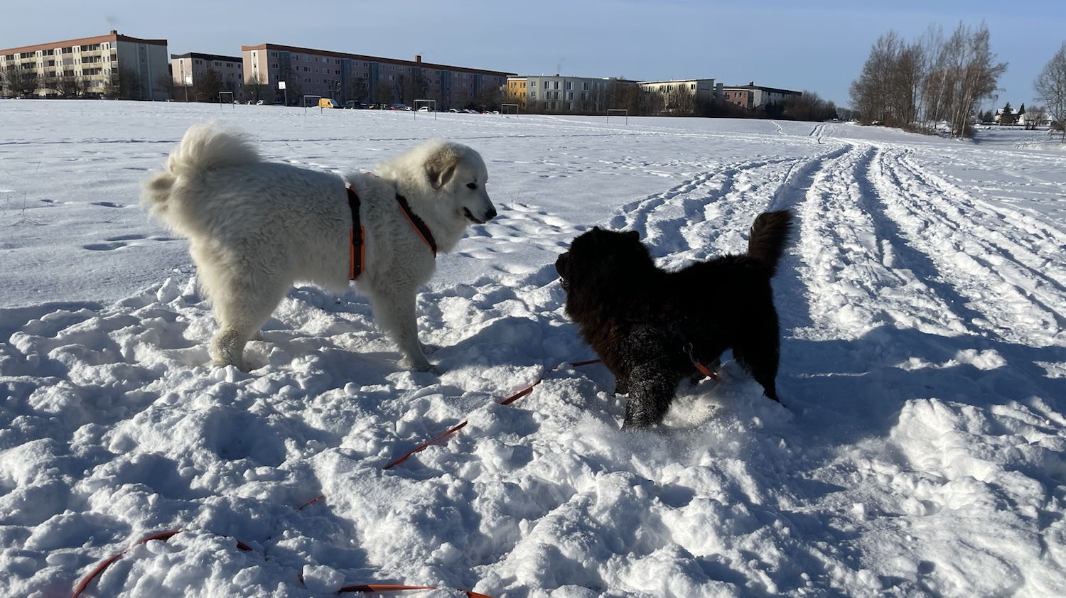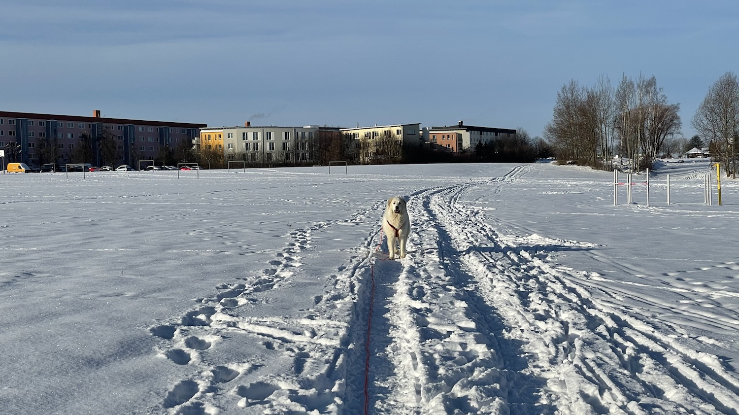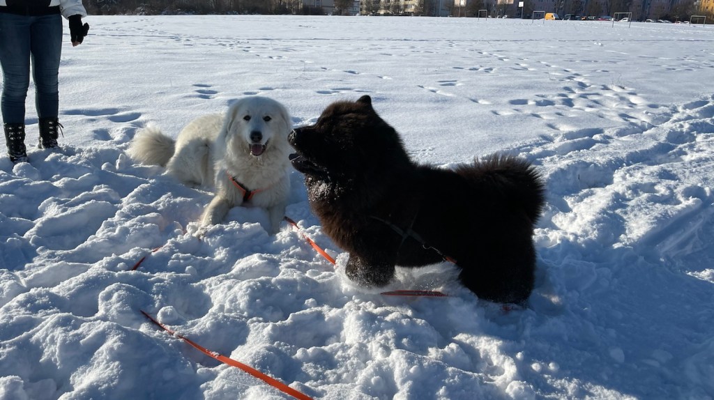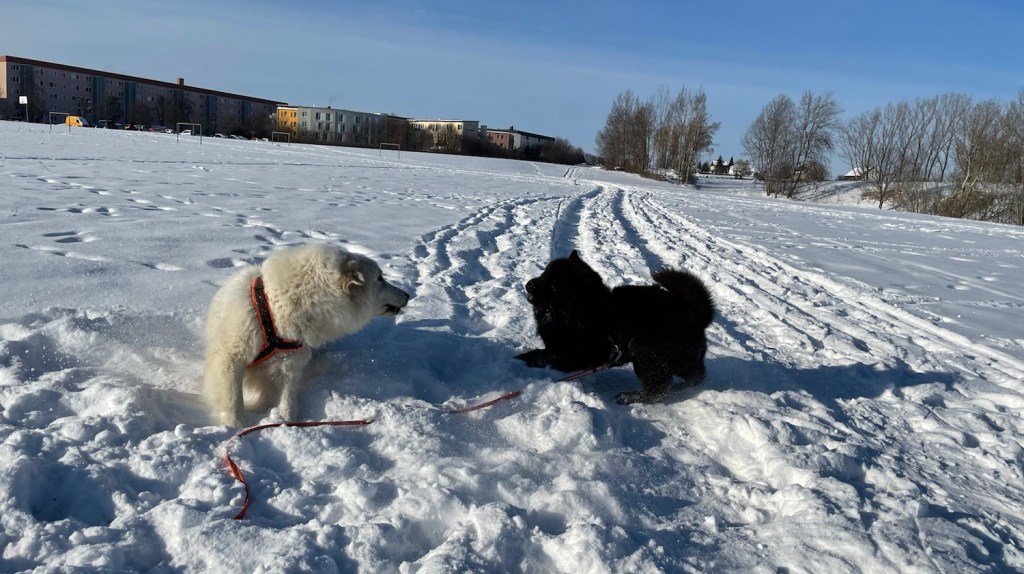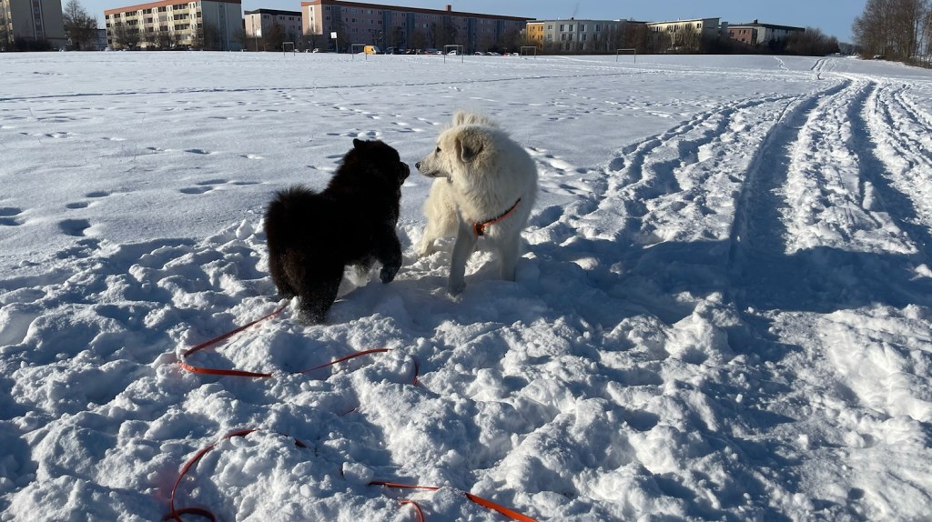 Wir sind zum großen Feldweg an einer großen Feldwiese gegangen. Da waren wieder viele Menschen. Manche hatten ganz lange Bretter an ihren Füßen. Ich bin aber mit meinem großen Mensch den Feldweg langgelaufen. Und da habe ich dann meine kleine Menschenschwester gesehen. Mein großer Mensch hat meine Führleine losgelassen und ich durfte hinflitzen. Da haben wir gekuschelt.