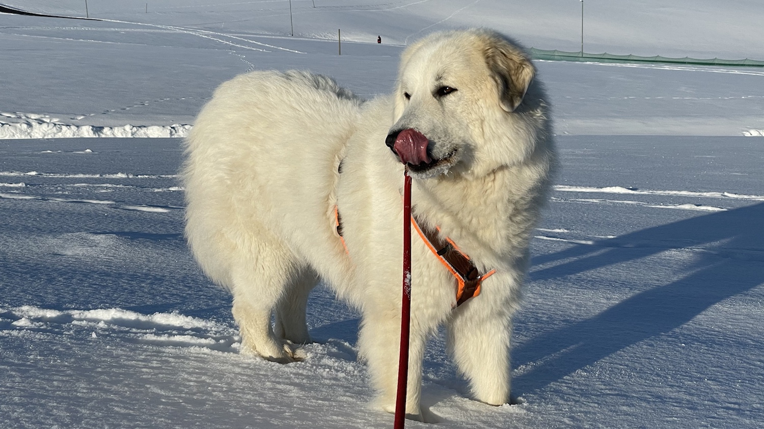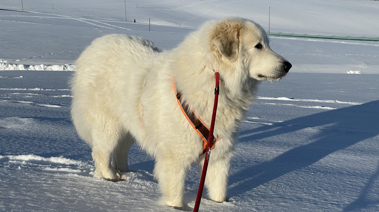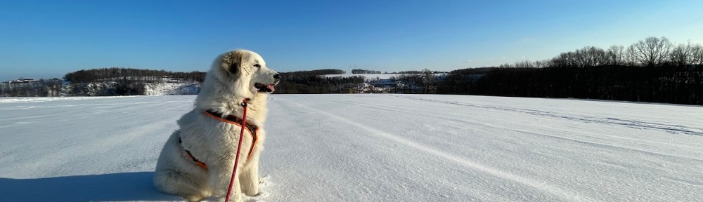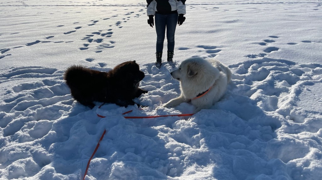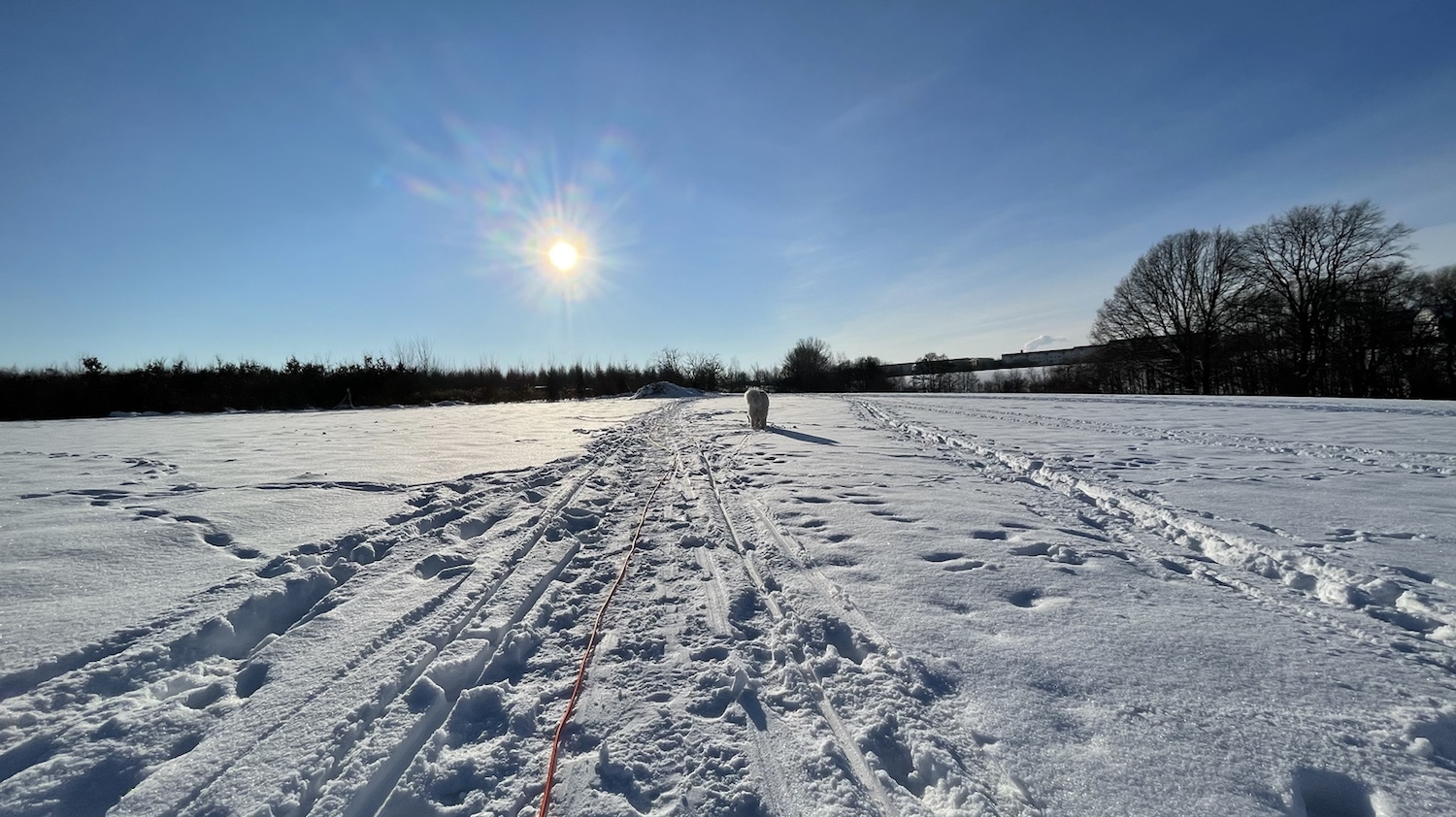 Wir sind zum großen Feldweg an einer großen Feldwiese gegangen. Da waren wieder viele Menschen. Manche hatten ganz lange Bretter an ihren Füßen. Ich bin aber mit meinem großen Mensch den Feldweg langgelaufen. Und da habe ich dann meine kleine Menschenschwester gesehen. Mein großer Mensch hat meine Führleine losgelassen und ich durfte hinflitzen. Da haben wir gekuschelt.