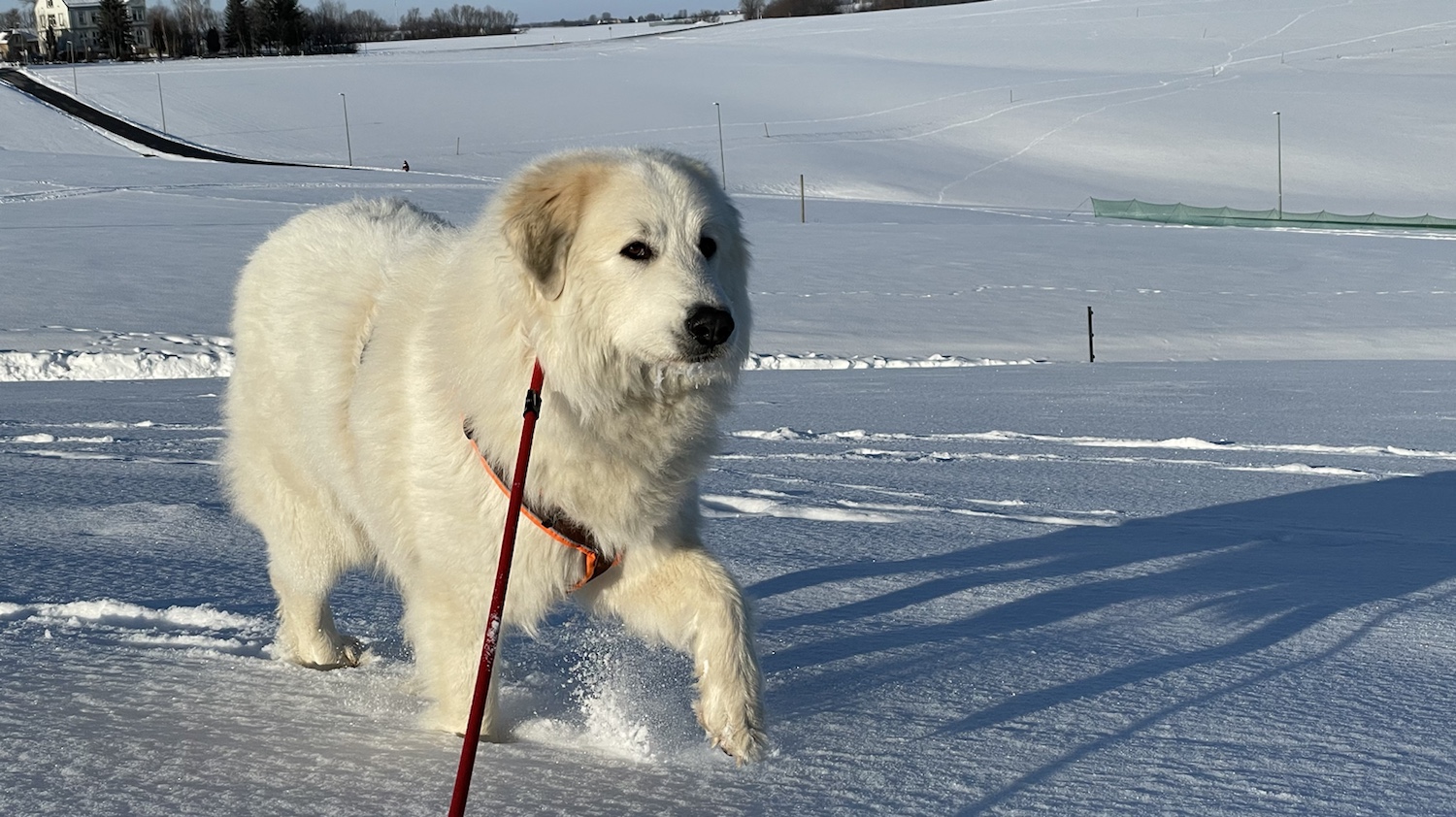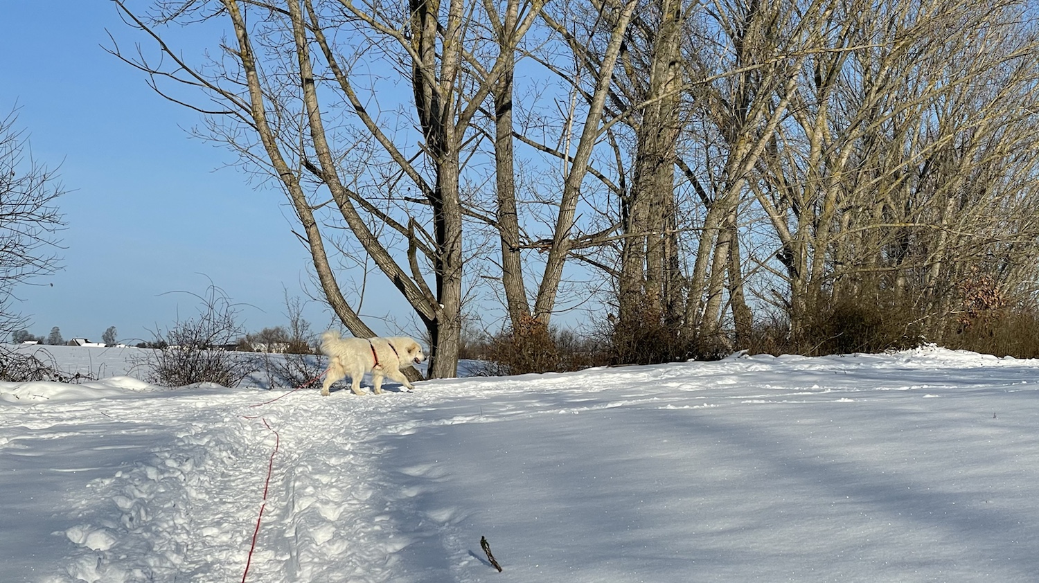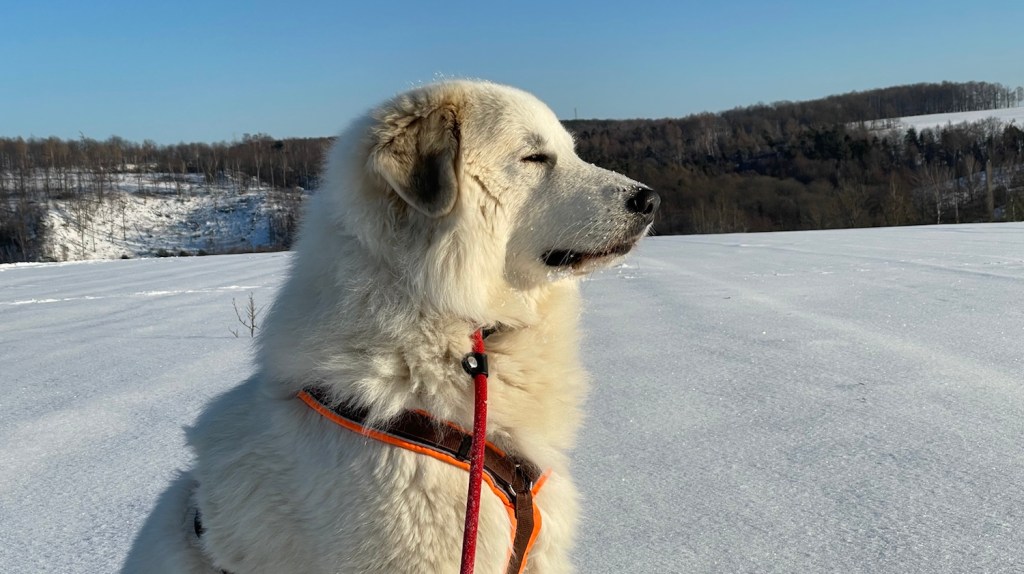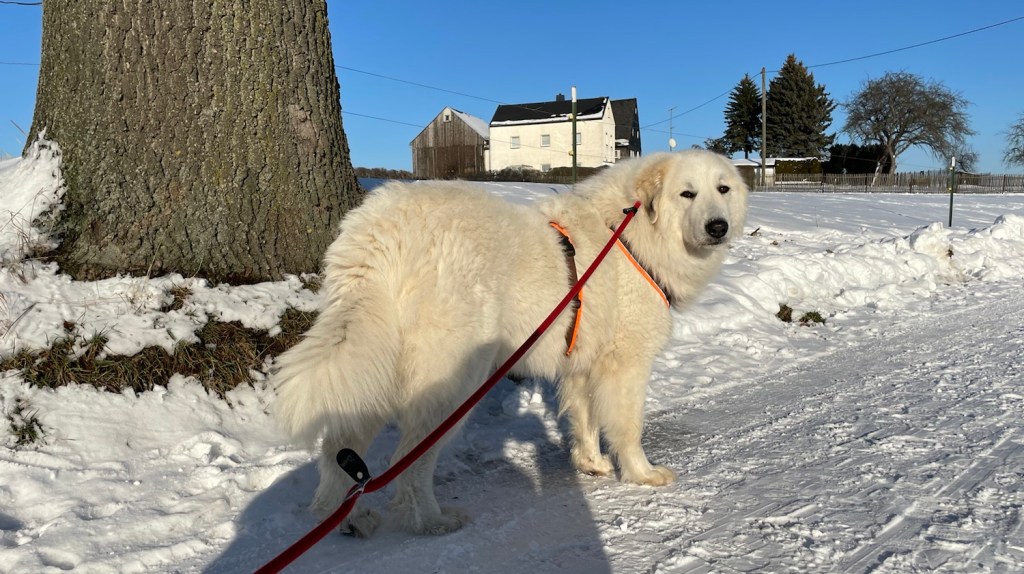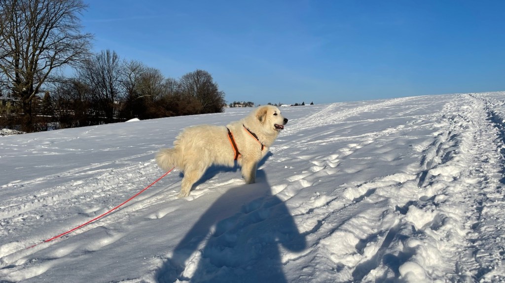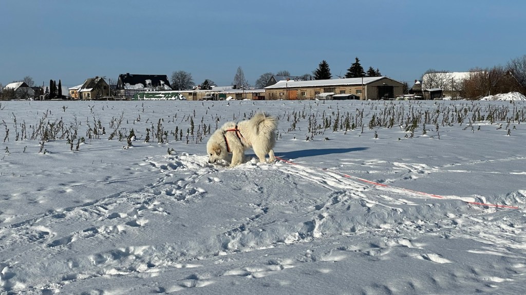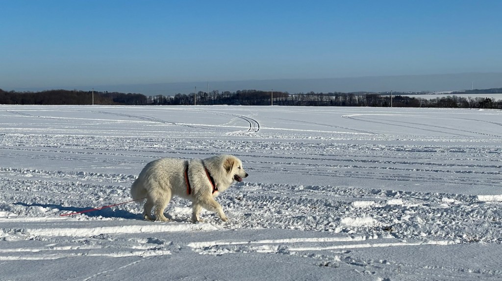 Ich bin dann aber weiter mit meinem großen Mensch und wir sind auf das Feld abgebogen. Zu den Schafen sind wir gegangen. Die Bella soll nämlich nicht „Schafs“ sagen, sondern „Schafe“. Schafs klingt trotzdem schöner. Die waren aber nicht da. Und die Ziegen auch nicht. Mein großer Mensch sagt, die sind im Stall, weiiil, die Wiesen sind jetzt zugedeckt, mit dem weißen Schnee. Durch den sind wir durchgestiefelt.