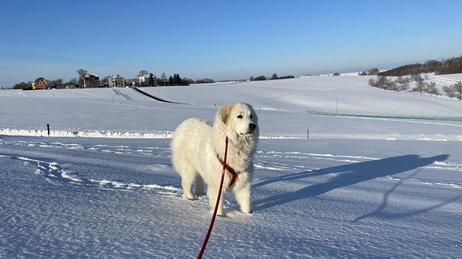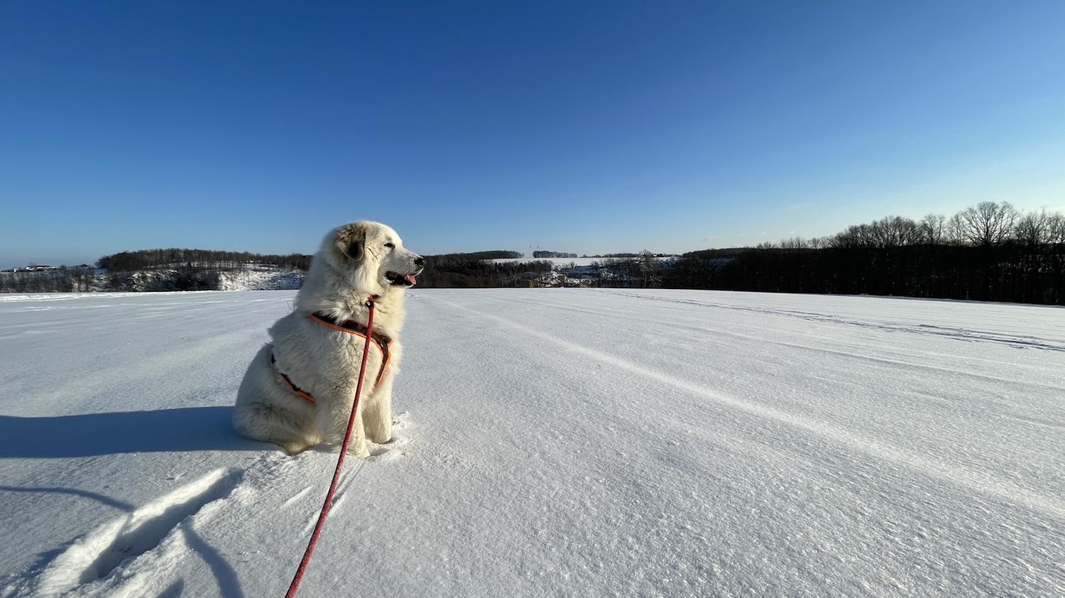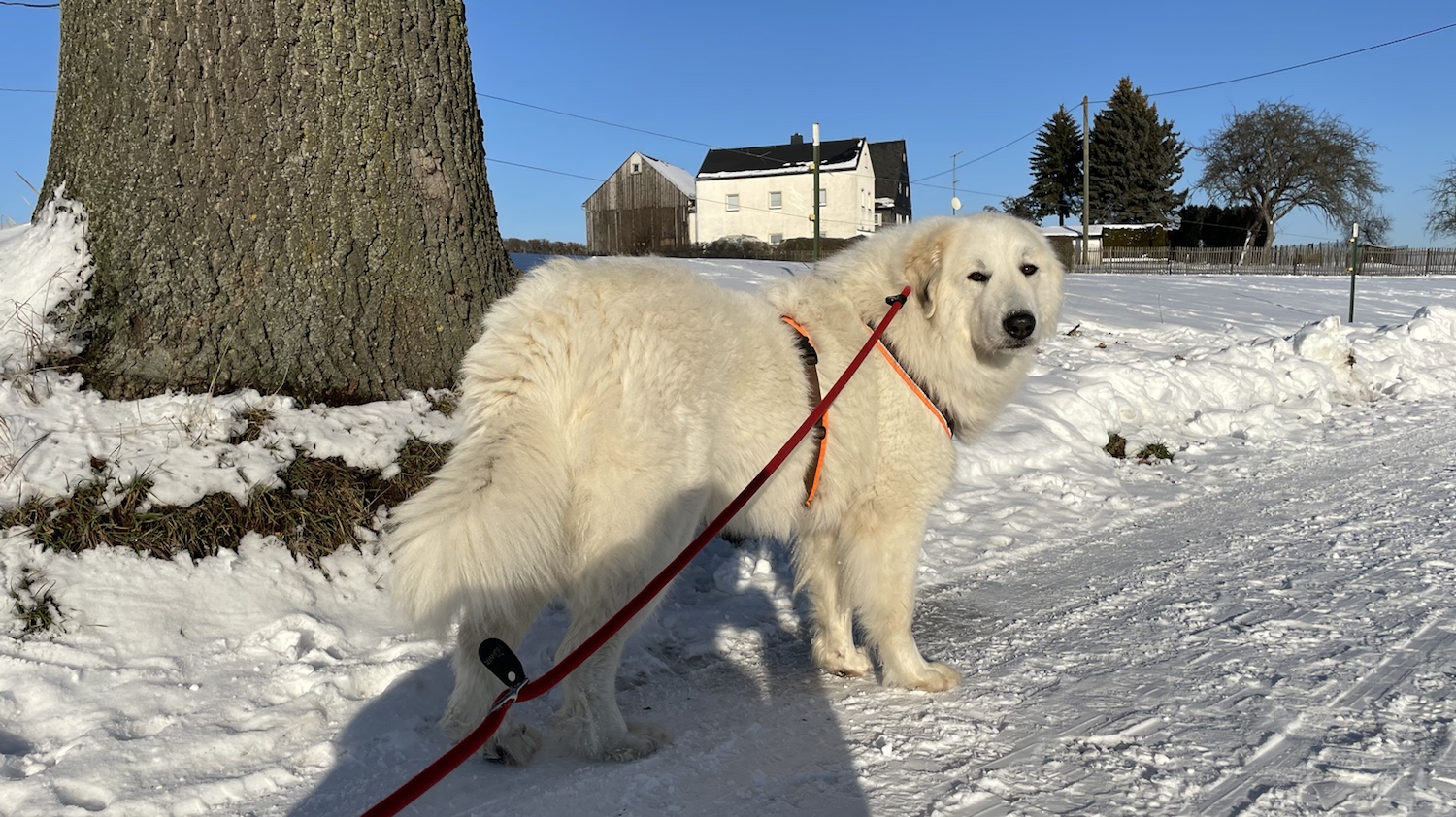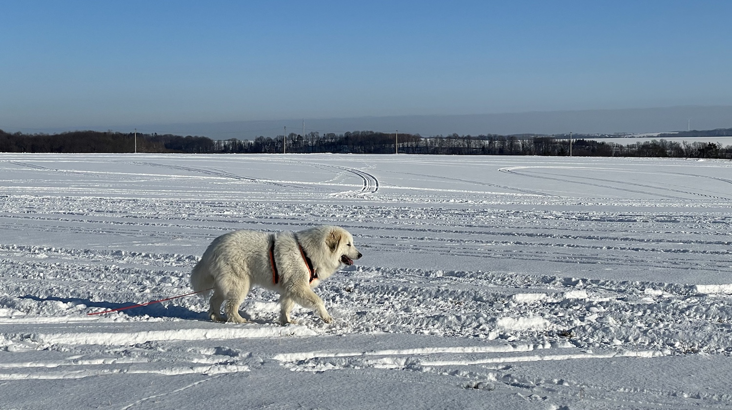 Ich bin dann aber weiter mit meinem großen Mensch und wir sind auf das Feld abgebogen. Zu den Schafen sind wir gegangen. Die Bella soll nämlich nicht „Schafs“ sagen, sondern „Schafe“. Schafs klingt trotzdem schöner. Die waren aber nicht da. Und die Ziegen auch nicht. Mein großer Mensch sagt, die sind im Stall, weiiil, die Wiesen sind jetzt zugedeckt, mit dem weißen Schnee. Durch den sind wir durchgestiefelt.