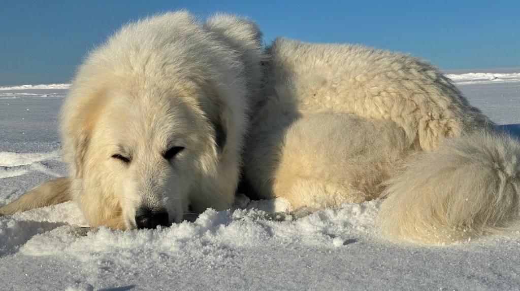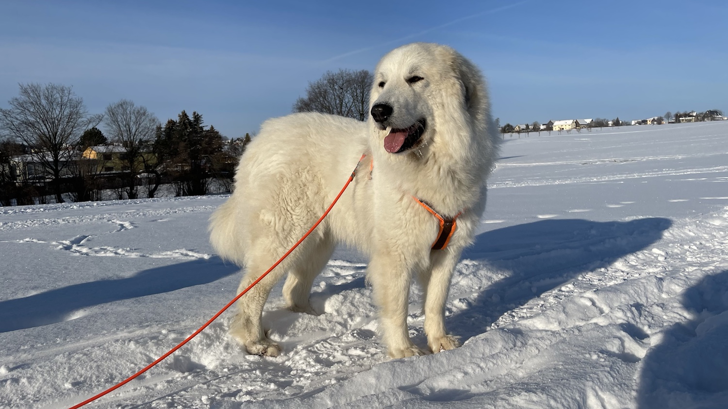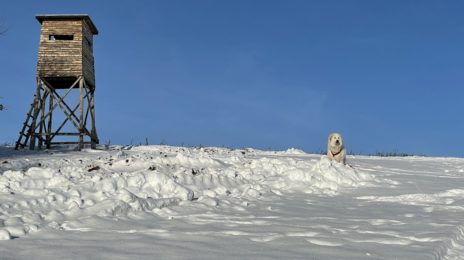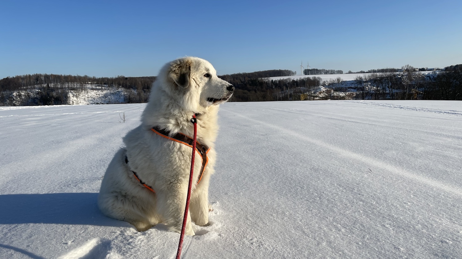 Ich bin dann aber weiter mit meinem großen Mensch und wir sind auf das Feld abgebogen. Zu den Schafen sind wir gegangen. Die Bella soll nämlich nicht „Schafs“ sagen, sondern „Schafe“. Schafs klingt trotzdem schöner. Die waren aber nicht da. Und die Ziegen auch nicht. Mein großer Mensch sagt, die sind im Stall, weiiil, die Wiesen sind jetzt zugedeckt, mit dem weißen Schnee. Durch den sind wir durchgestiefelt.