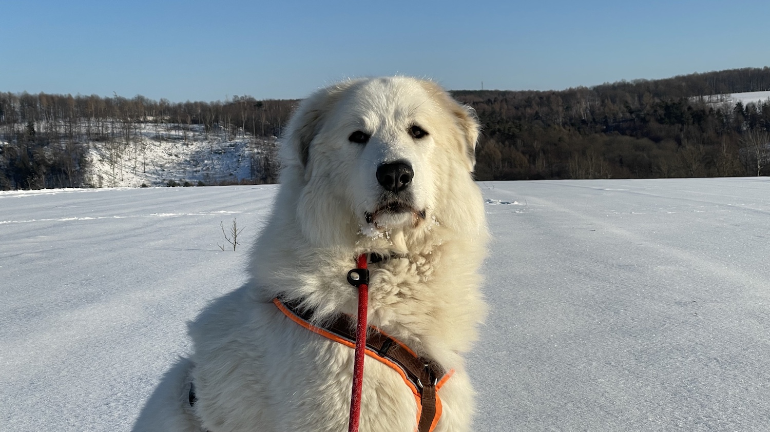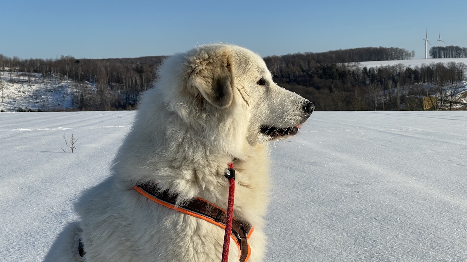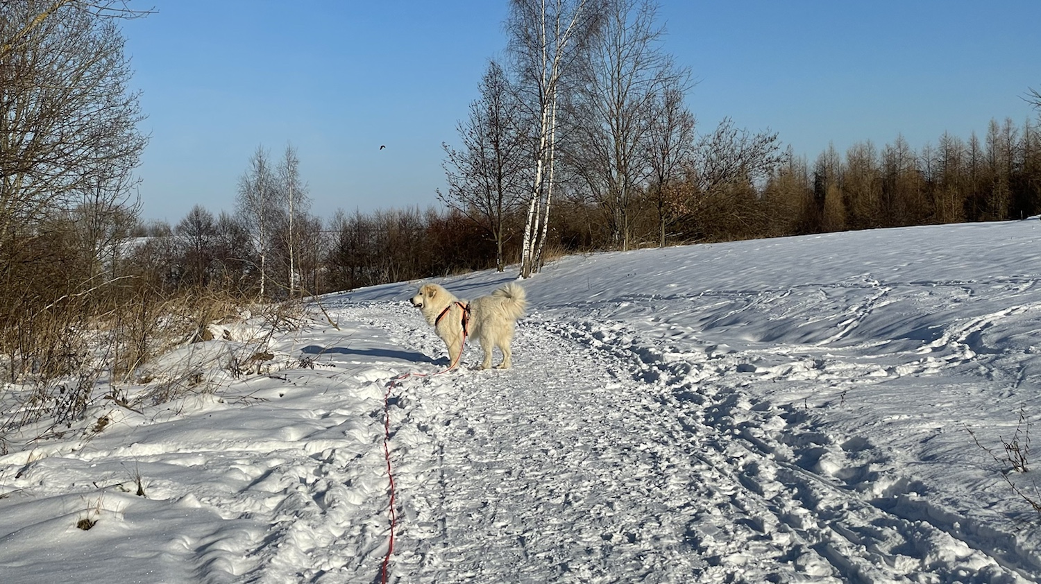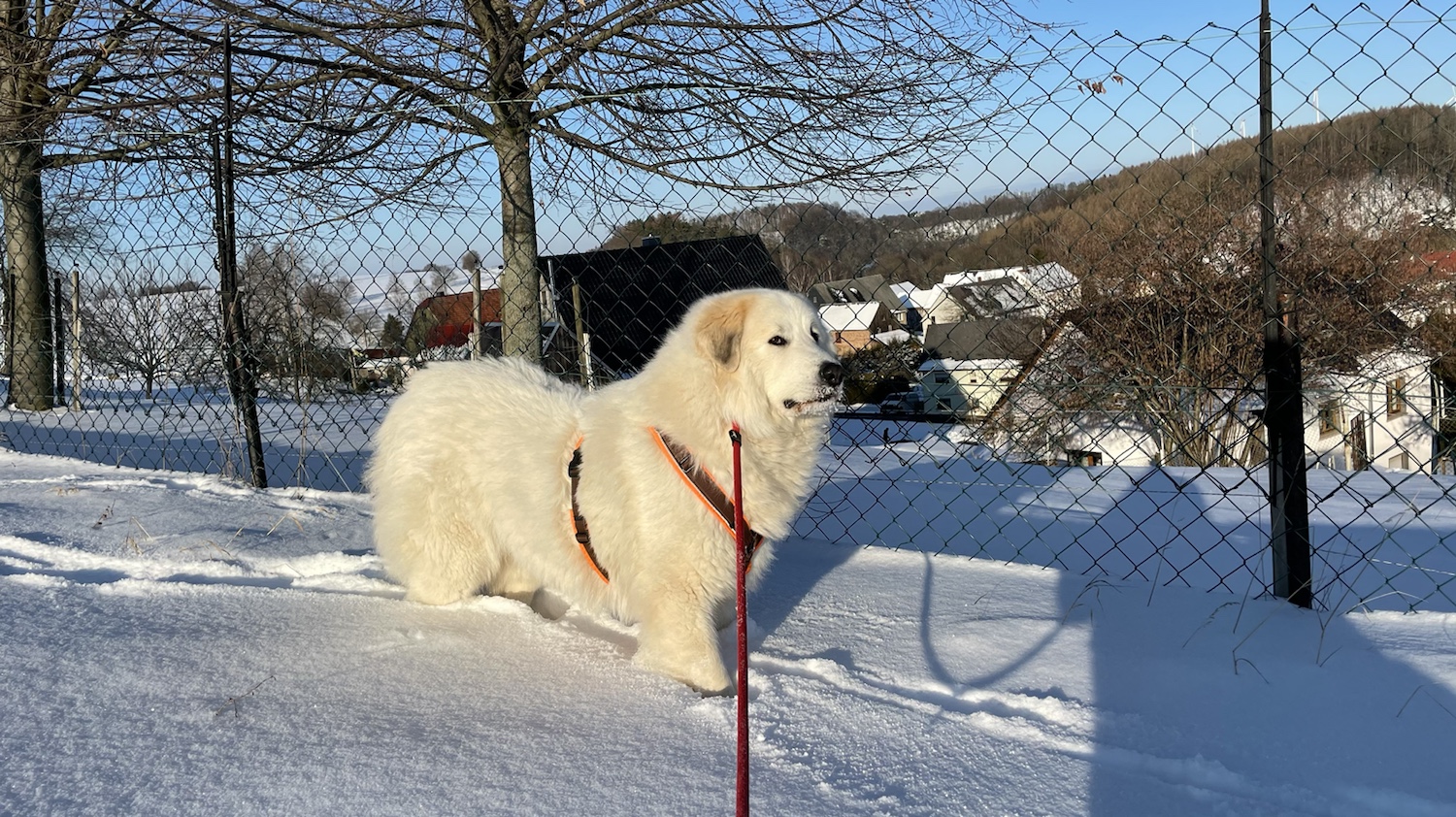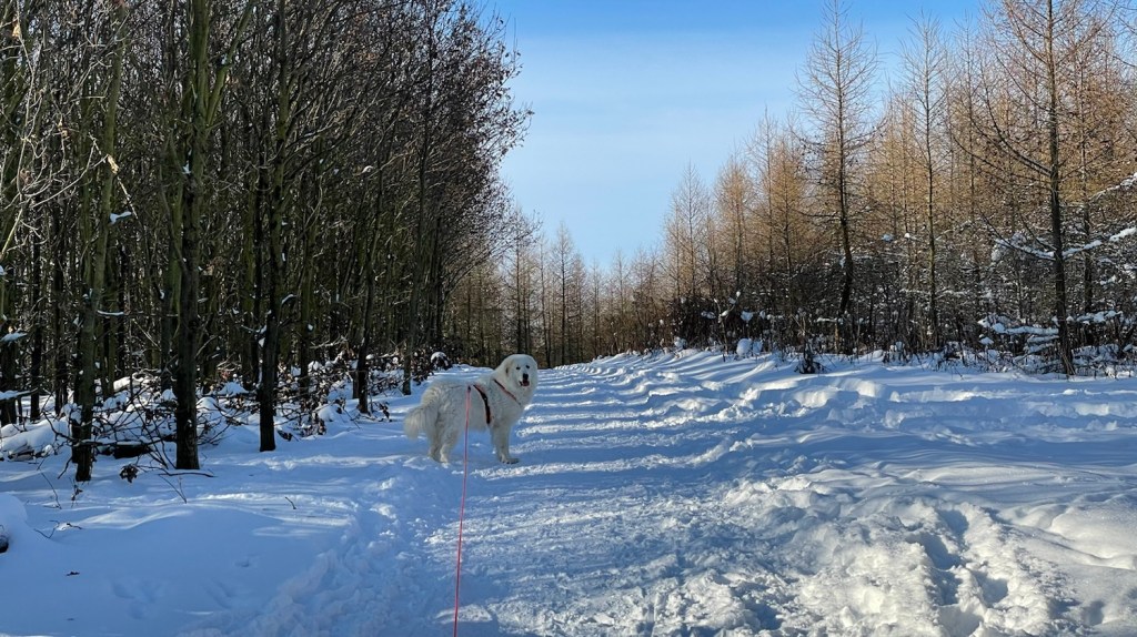Wir sind dann weitergelaufen zum Skihang. Und kurz davor haben wir auf der Wiese eine Hündin getroffen. Die Jogo. Das Chow Chow Mädchen. Die kenne ich schon. Heute haben wir aber nicht gespielt. Wir haben uns nur angeschnurrt. Wie Kätzchen. Da sind wir dann lieber weitergelaufen. Auf dem schönen kleinen Waldweg. Da kam uns ein großer Rundbeiner entgegen. Den habe ich erstmal gestoppt. Mein großer Mensch hat gesagt, man muß da rübergehen. Damit der Rundbeiner vorbei kann. Nö. muß man nicht. Die Bella war zuerst da. Ich lasse niemanden einfach vorbei. Ich bin eine Herdenschutzhündin. Eine Pyri!