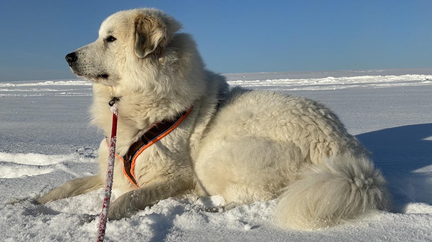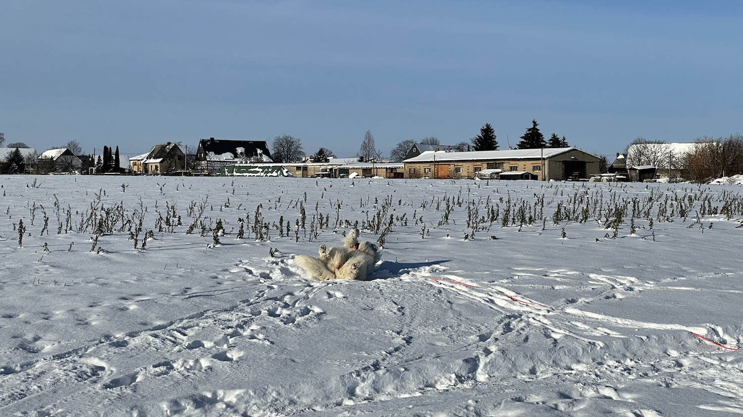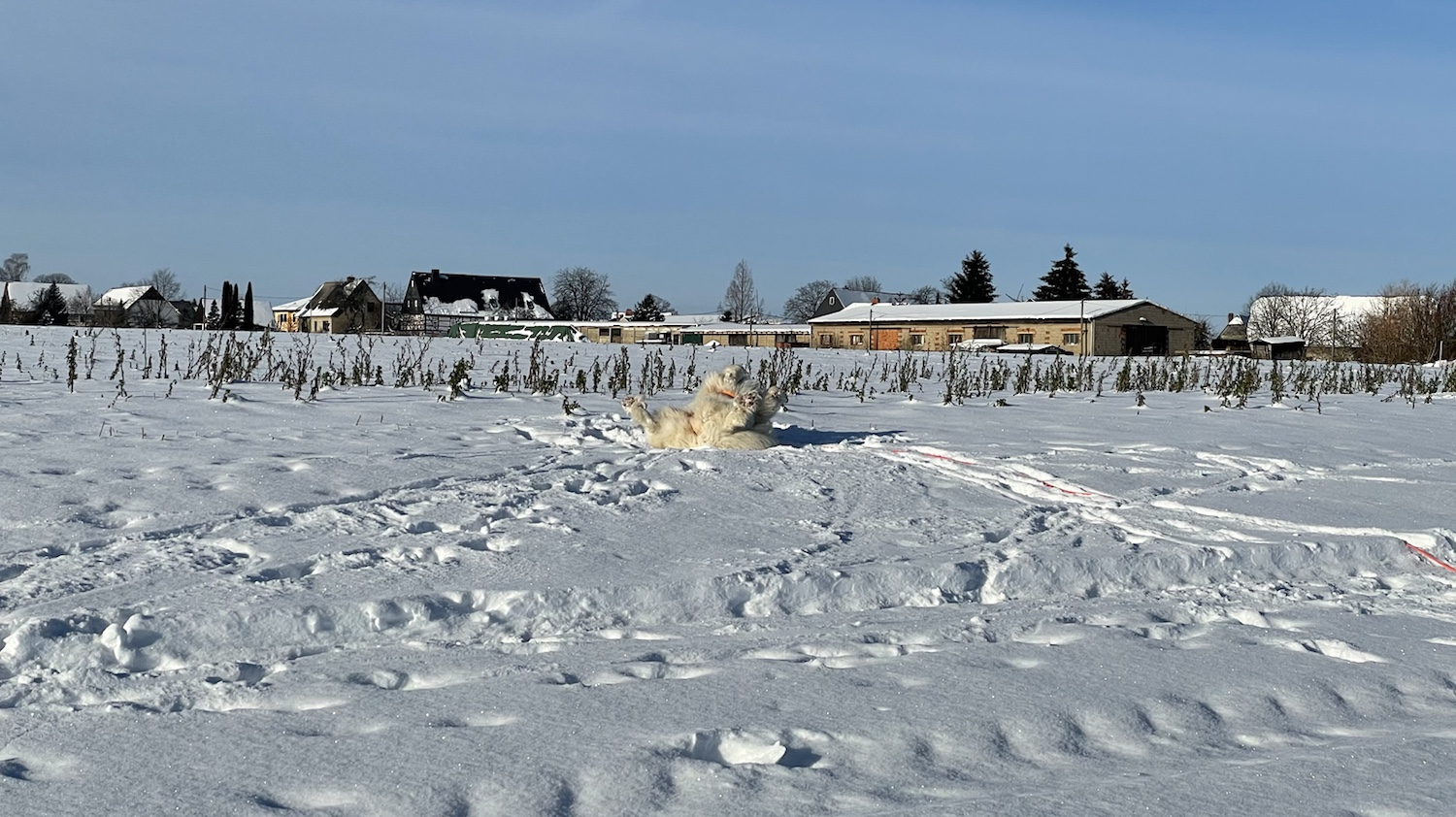 Auf der anderen Seite vom großen Feld habe ich mich dann auch erstmal ganz wild im Schnee gewälzt. Mein schönes champagnercremeweißfarbenes Pyrifell ist auch gar nicht schmutzig und naß geworden.