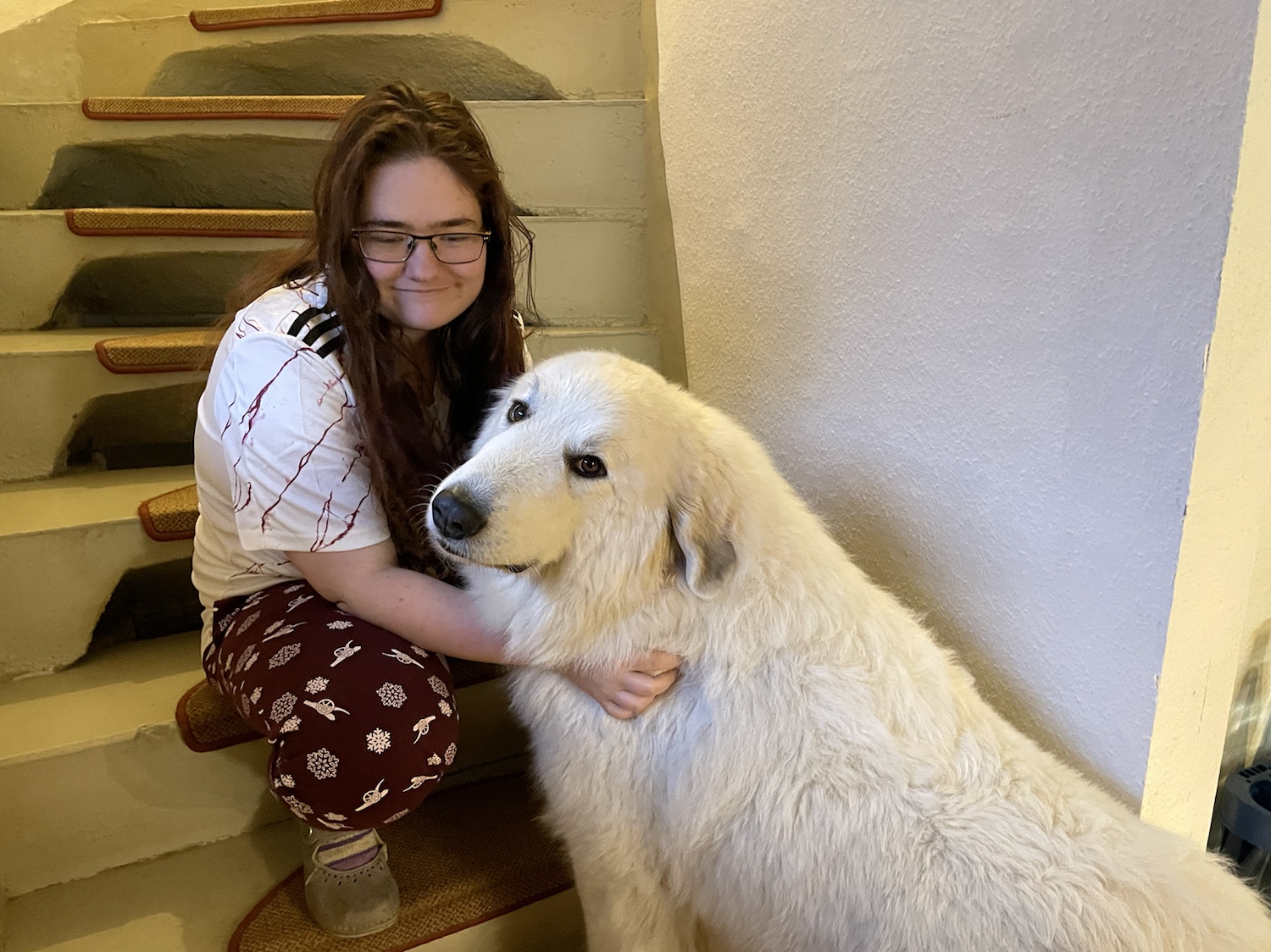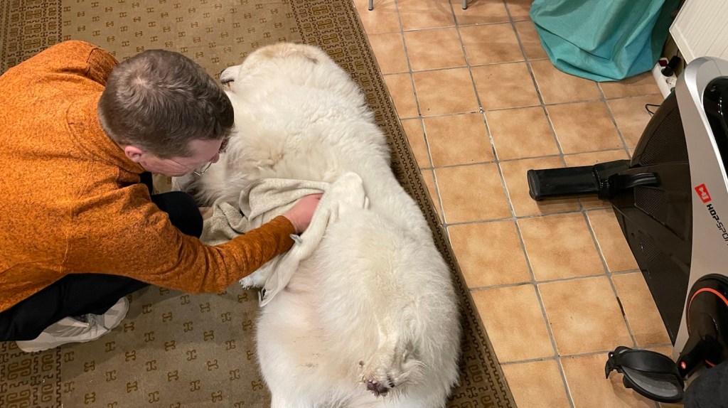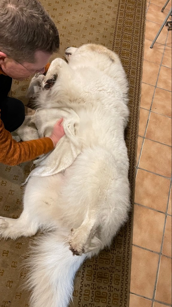 Mein großer Mensch ha mich dann in meiner Kellerwohnung schön trockengerubbelt. Mit dem Pyriprinzessinnentrockenrubbelhandtuch. Erst mein Pyriköpfchen, dann mein champagnercremeweißfarbenes Pyrifell und dann auch noch mein Pyribäuchlein. Da war meine große Menschenschwester auch dabei. Und ich habe noch weiße Wölfin gespielt und ganz grimmig geguckt und bei meinem großen Mensch in die Hand gebissen. Ganz vorsichtig, weiiil, ich kann ja meinen großen Mensch nicht kaputt machen. Den brauche ich ja noch und außerdem bin ich seine Pyri.