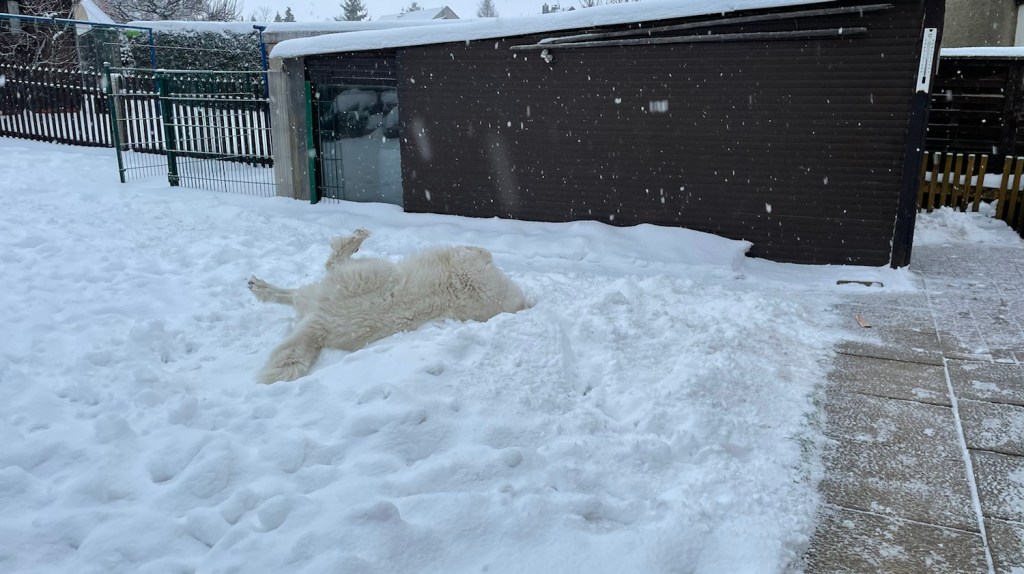Ich habe dann von meiner großen Menschin mein Futter bekommen. Habe aber auch nur ganz wenig gefuttert. Ich habe eben jetzt mal keinen Appetit. Dafür bin ich dann gleich raus in meinen Garten. In den Schnee. Und da habe ich mich schön gewälzt. Das macht nämlich Spaß. Ganz viel!
