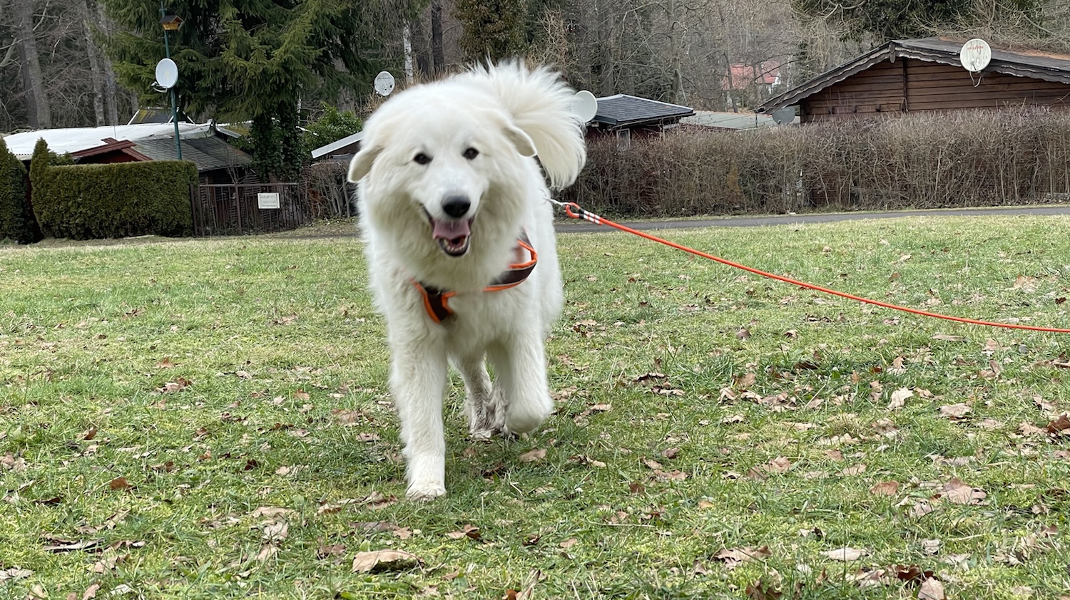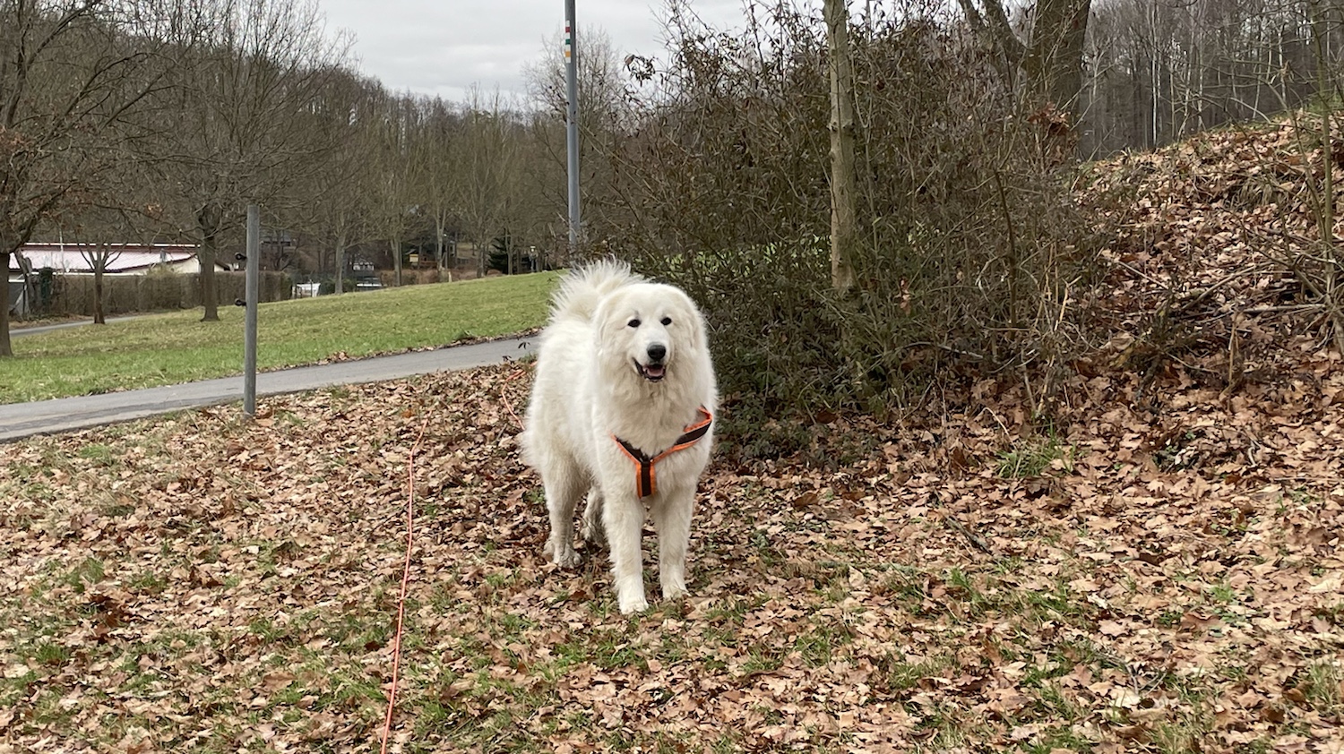 Dann war Nachmittag. Meinen Pyriprinzessinnenschönheitsschlaf hatte ich schon gemacht. Da ist mein großer Mensch nach Hause gekommen. Und wir sind gleich spazieren gegangen. Mein großer Mensch hat mir gesagt, wo wir hingehen wollen und dann durfte ich führen. Ich kenne mich hier aus.