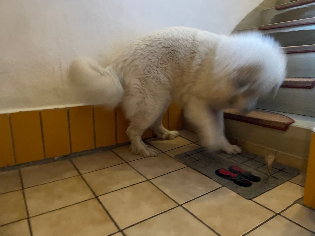 Mein großer Mensch ist heute früh wieder ganz zeitig zu seiner Arbeit gefahren. Ich durfte noch schlummern, weiiil, meine Arbeit geht erst später los. Meine große Menschin war dann einkaufen und danach habe ich mein Frühstücksfutter bekommen. In meinem kleinen roten Ferienhäuschen.