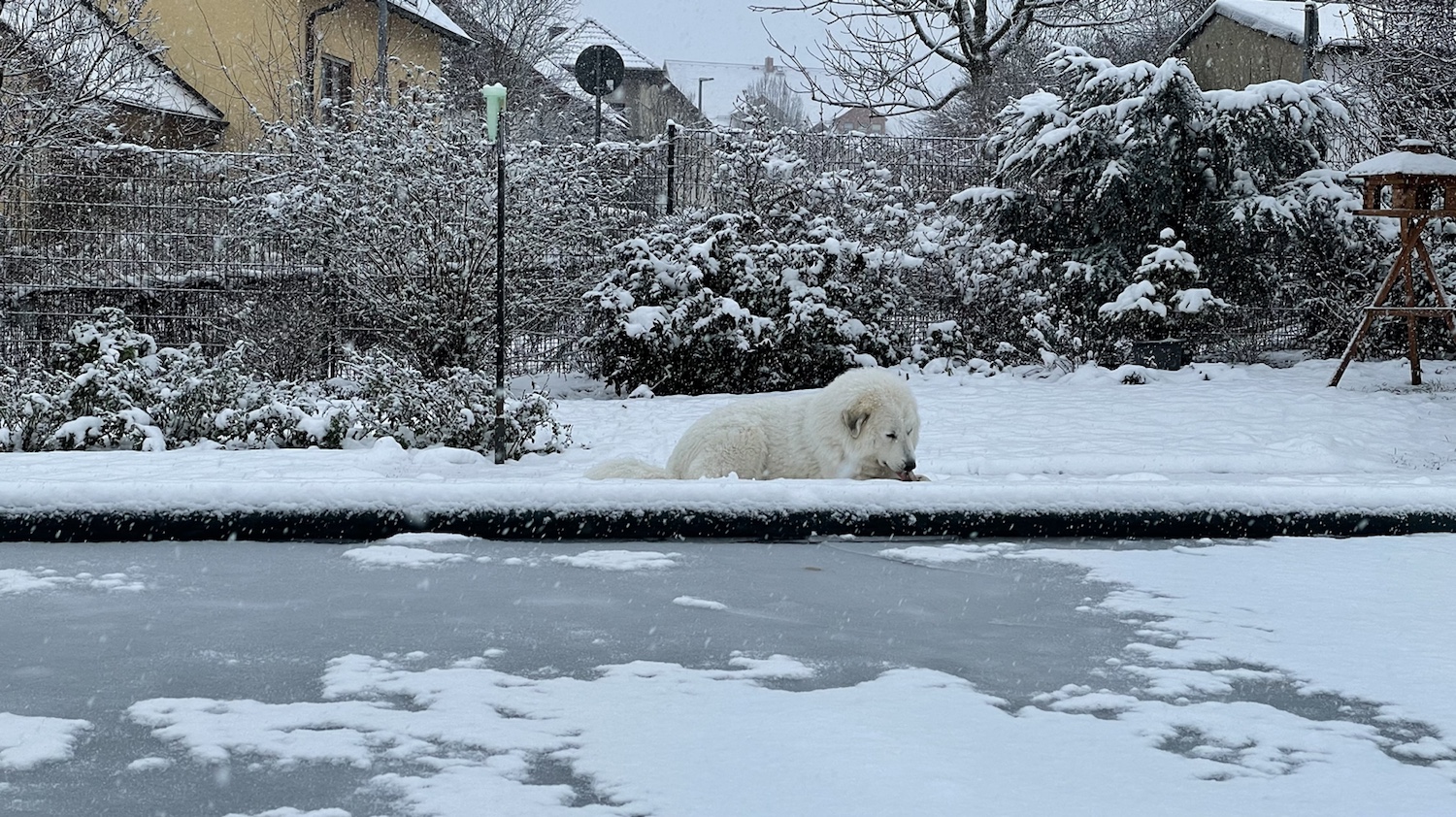 Heute früh hat die kleine Bella wieder ganzganz lange ausgeschlummert. Schließlich ist ja noch Wochenende. Sonntag! Da darf man lange schlummern. Bis es vom großen Mensch Frühstücksfutter gibt. Und gleich danach bin ich in meinen Garten. Es hat wieder geschneet. Und ich habe auf meinen großen Mensch gewartet. Wegen Sonntagsspaziergang! Aber bevor es losging hat die Bella noch ihren versteckten Knochen geknabbert. Am Pool!