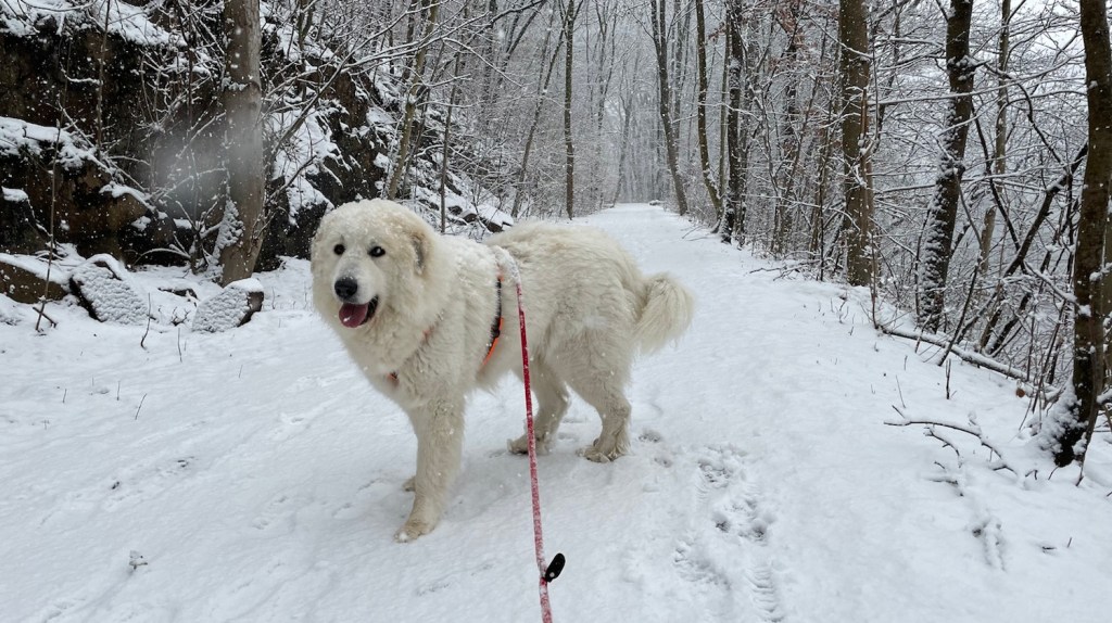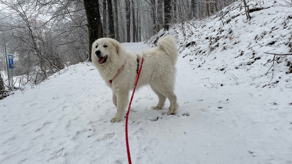 Dann sind wir losgewandert. Die Straße entlang bis zum Stadtpark. Und in den sind wir rein. Es hat immer noch geschneet. Und wir sind schön den Weg langgelaufen. Bis zur „Rodelbahn“. Da mußte die Bella ganz vorsichtig sein, damit der große Mensch nicht hinpurzelt.
