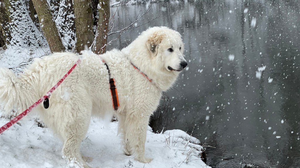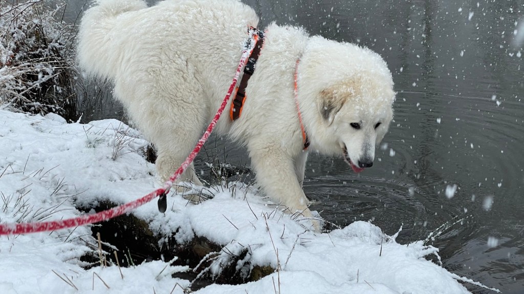 Ich bin dann noch über die Wiese mit meinem großen Mensch an die Tschooo-Pauuu gegangen. Und da habe ich Wasser geschleckert. Es hat immer noch ganz wild geschneet. Die Kormorane saßen auch wieder auf ihren Bäumen.