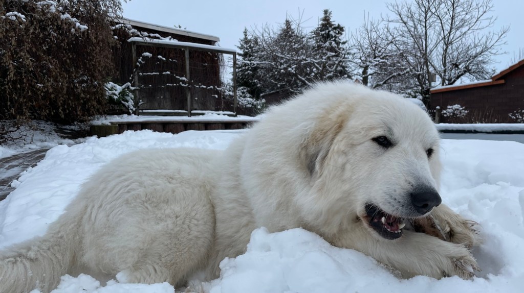 Und danach habe ich es mir wieder in meinem Garten gemütlich gemacht. Meinen Knochen habe ich nochmal angenagt. Den verstecke ich immer im Schnee. Da, wo ihn niemand finden kann. Weiiil, der gehört mir.