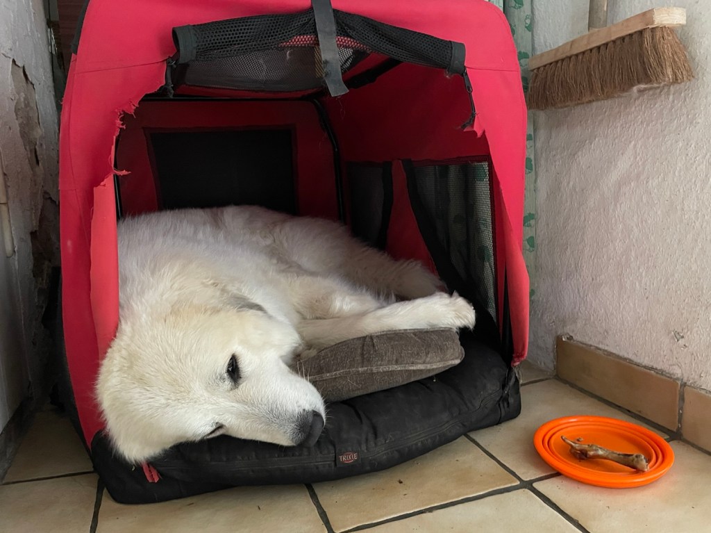 Nach dem Abendspaziergang habe ich mich im Keller gleich hingelegt. Mein großer Mensch hat noch schön mit mir gekuschelt und dann meinen Knabberteller fertig gemacht. Dann habe ich mich in mein kleines rotes Ferienhäuschen gekuschelt, noch geknabbert und schön geschlummert. Gute Nacht! 🐶👸🏼