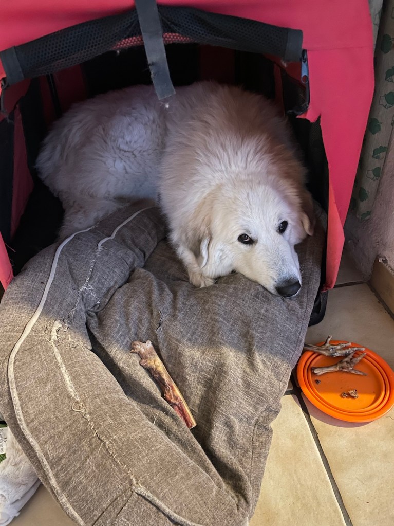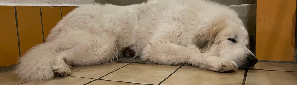 Ich habe heute früh noch ganz fest in meinem kleinen roten Ferienhäuschen geschlummert, da kam mein großer Mensch und hat mir mein Frühstücksfutter gebracht. Aber vorher hat er ganz lieb mit seiner Bella, das bin ich, die wunderschöne Pyrenäenbergprinzessin, gekuschelt.