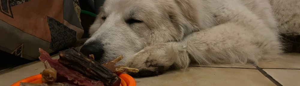 Heute früh hat mich mein großer Mensch wieder begrüßt und mir mein Leberwurschtbrot mit Leberwurscht drauf gebracht. Das habe ich gleich aufgeschmatzt. Und dann habe ich noch mein Restfutter vom Wochenende bekommen. Nudeln mit Gewiegtem vom Rindviehch, schön gebraten. Und heute hatte ich wieder Appetit und habe alles reingeschmatzt. Das war ganz lecker.