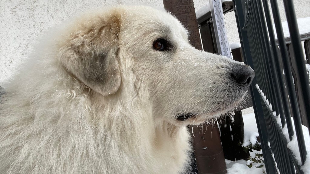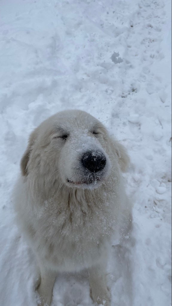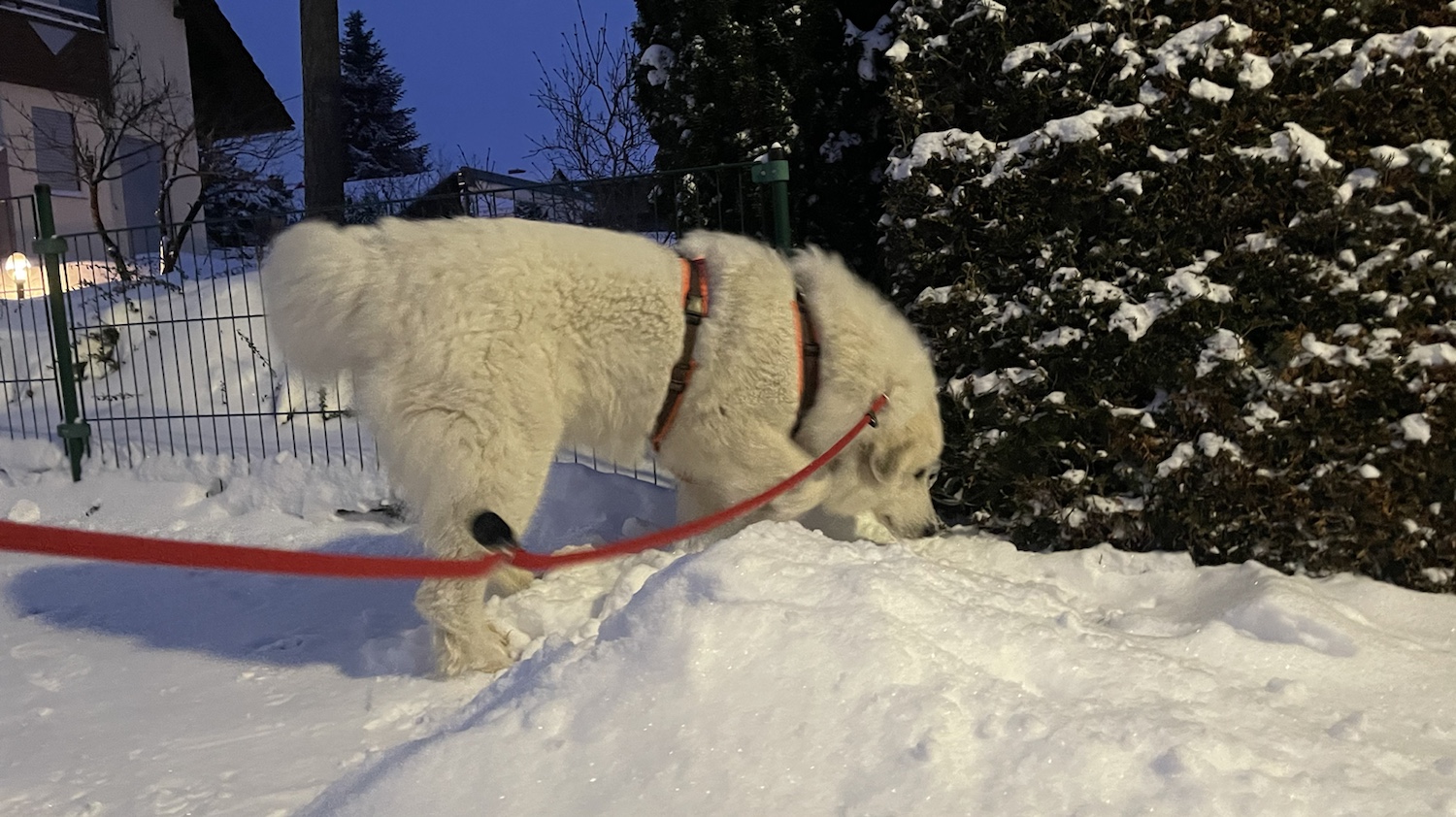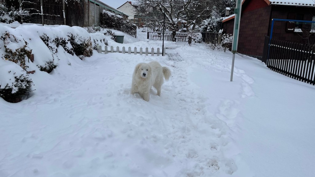 Ich bin später mit meinen Menschen raus in meinen Garten. In der Nacht hat es wieder ganz viel geschneet. Weißen Schnee! Keinen roten. Und dann habe ich mit meinen Menschen den Schnee geschaufelt. Also meine Menschen haben geschaufelt. Ich bin durch den Schnee getobt.