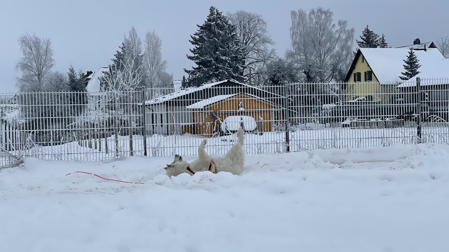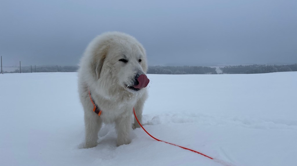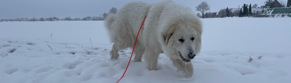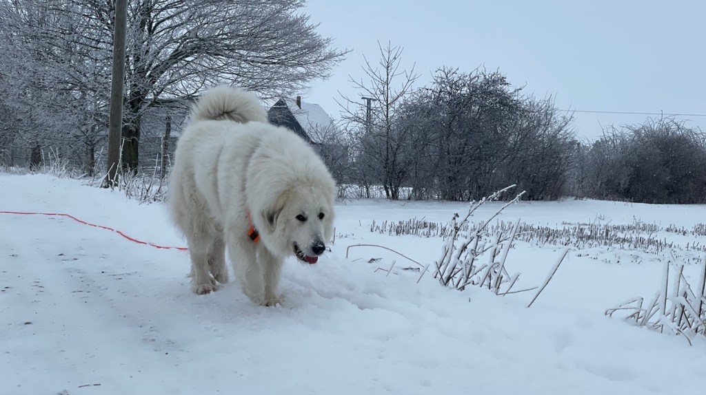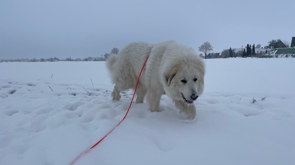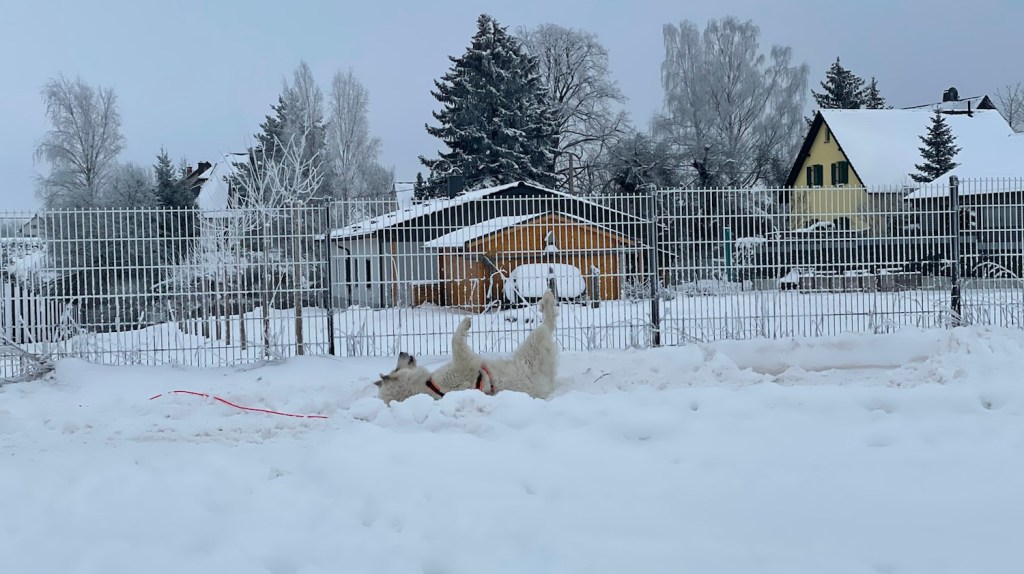 Mein großer Mensch hat auch gefrühstücksfuttert und dann sind wir losgewandert. Zuerst durch mein Wohngebiet und weiter zur großen Wiese hinter meinem Wohngebiet. Da habe ich wieder meine lange orangene Feldleine bekommen. Ich habe mich erstmal im Schnee gewälzt. Und dann sind wir über die ganze große Wiese gelaufen.