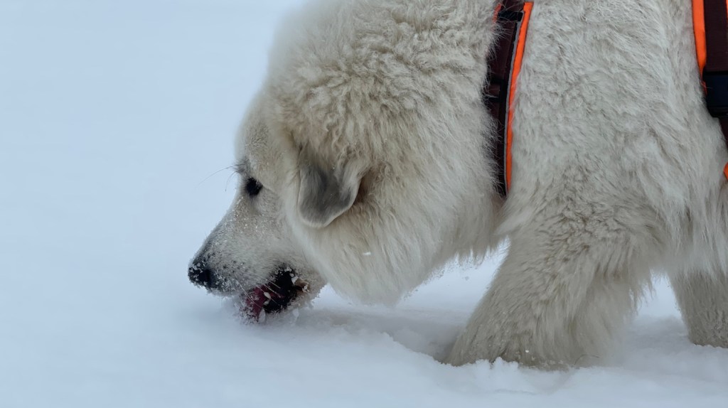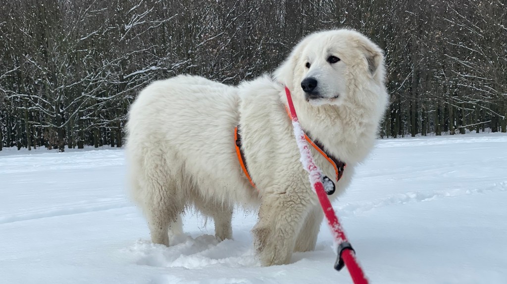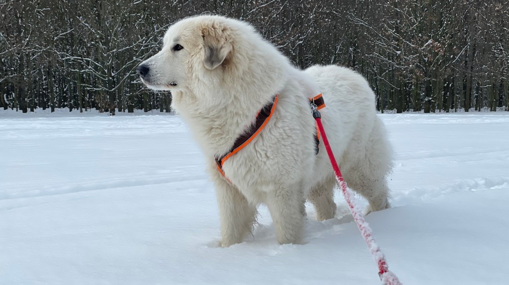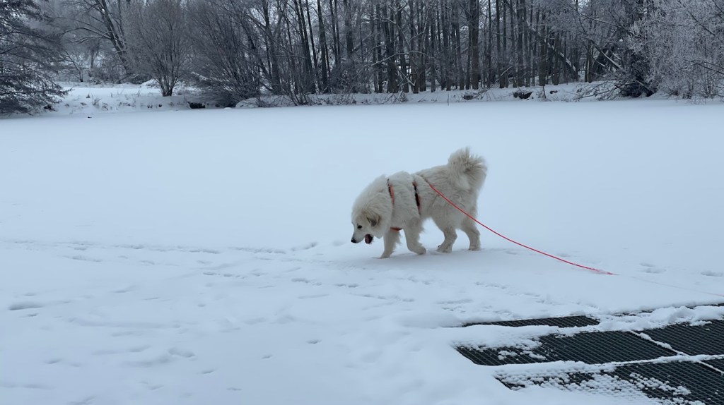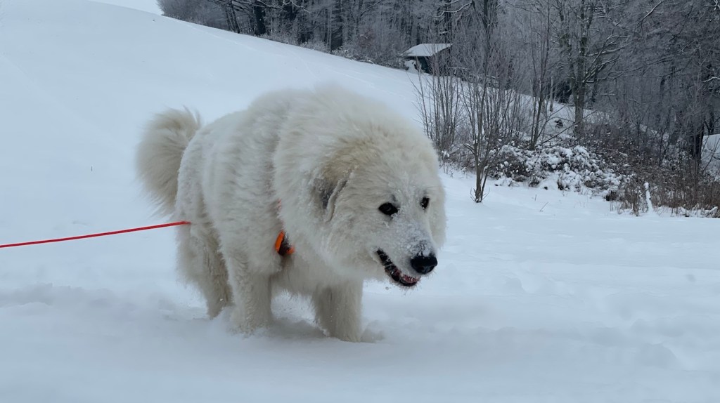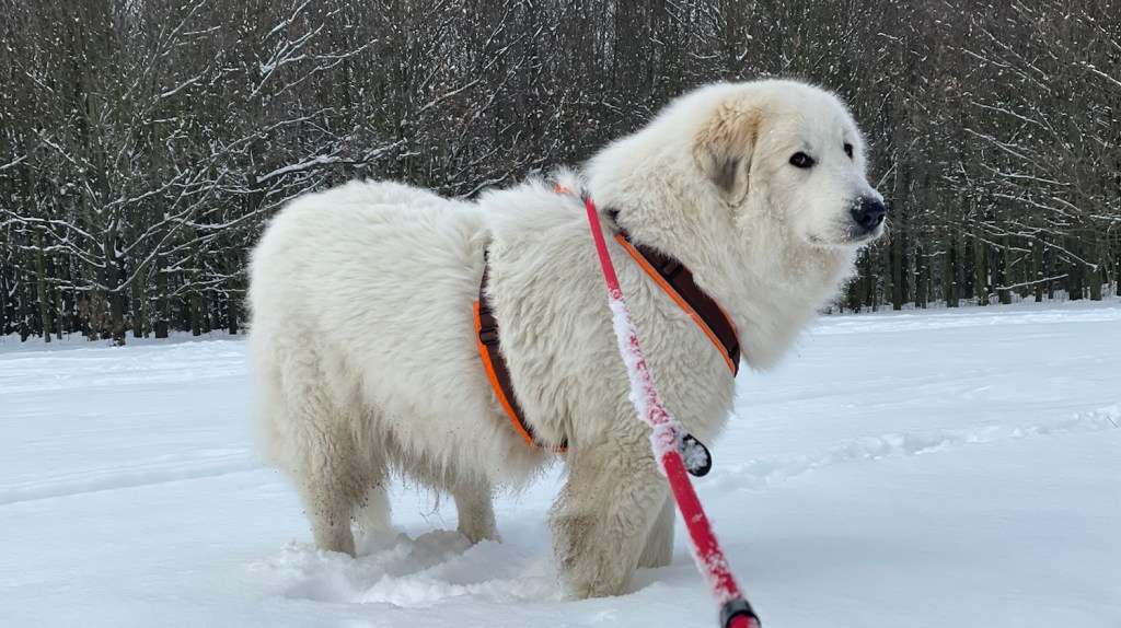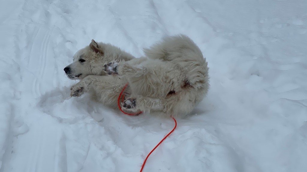 Mein großer Mensch hat auch gefrühstücksfuttert und dann sind wir losgewandert. Zuerst durch mein Wohngebiet und weiter zur großen Wiese hinter meinem Wohngebiet. Da habe ich wieder meine lange orangene Feldleine bekommen. Ich habe mich erstmal im Schnee gewälzt. Und dann sind wir über die ganze große Wiese gelaufen.