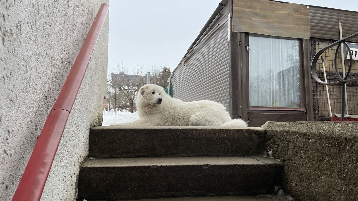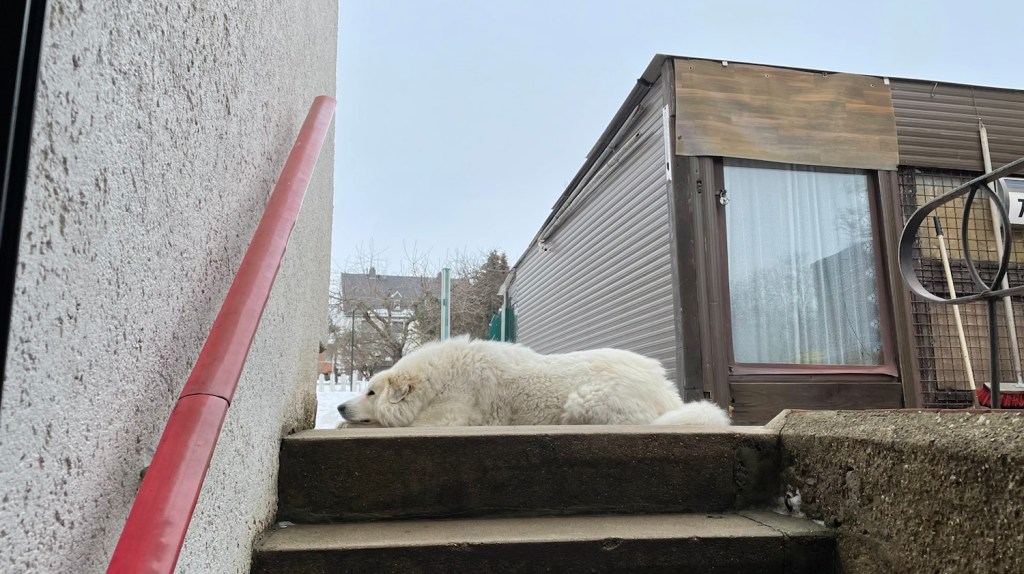 Unseren Abendspaziergang haben wir wieder durch mein Wohngebiet gemacht. Eine große Runde sind wir gelaufen. Da haben wir gleich erstmal den Bogolf getroffen. Das ist der große weiße Schweizer Schäferhund. Der ist ganz lieb. Ist ja ein Junge. Und auch eine Katze haben wir getroffen. Die ist aber gleich weggelaufen. Auf dem Heimweg sind wir bei der Kira vorbei. Aber die hat mich gar nicht bemerkt.