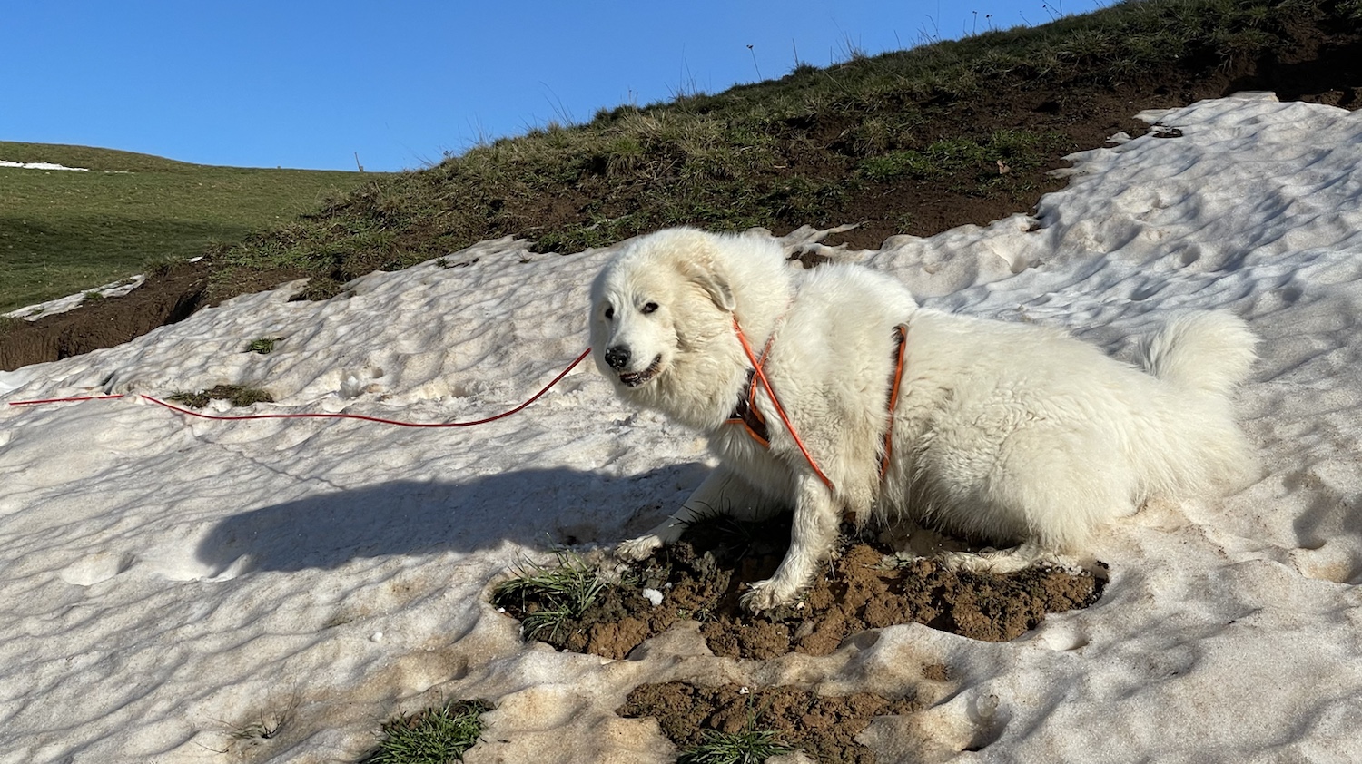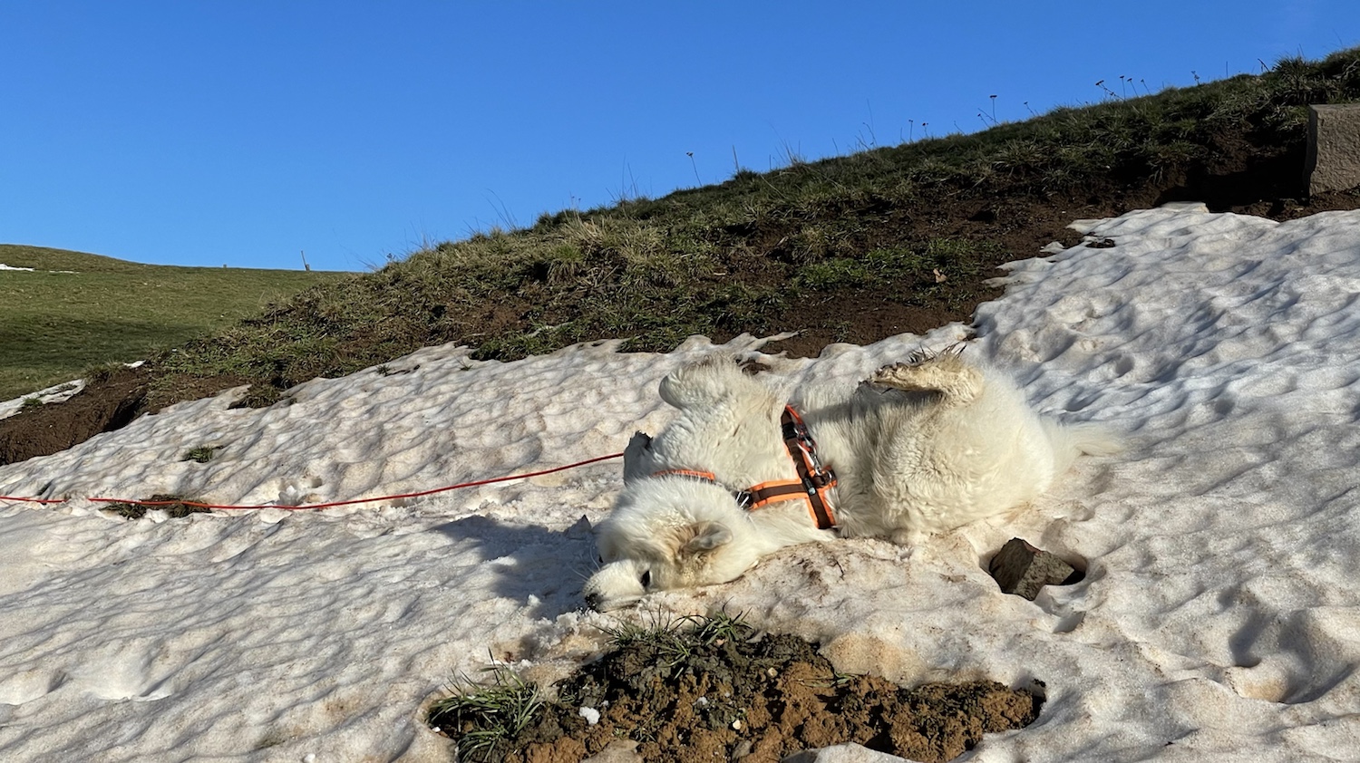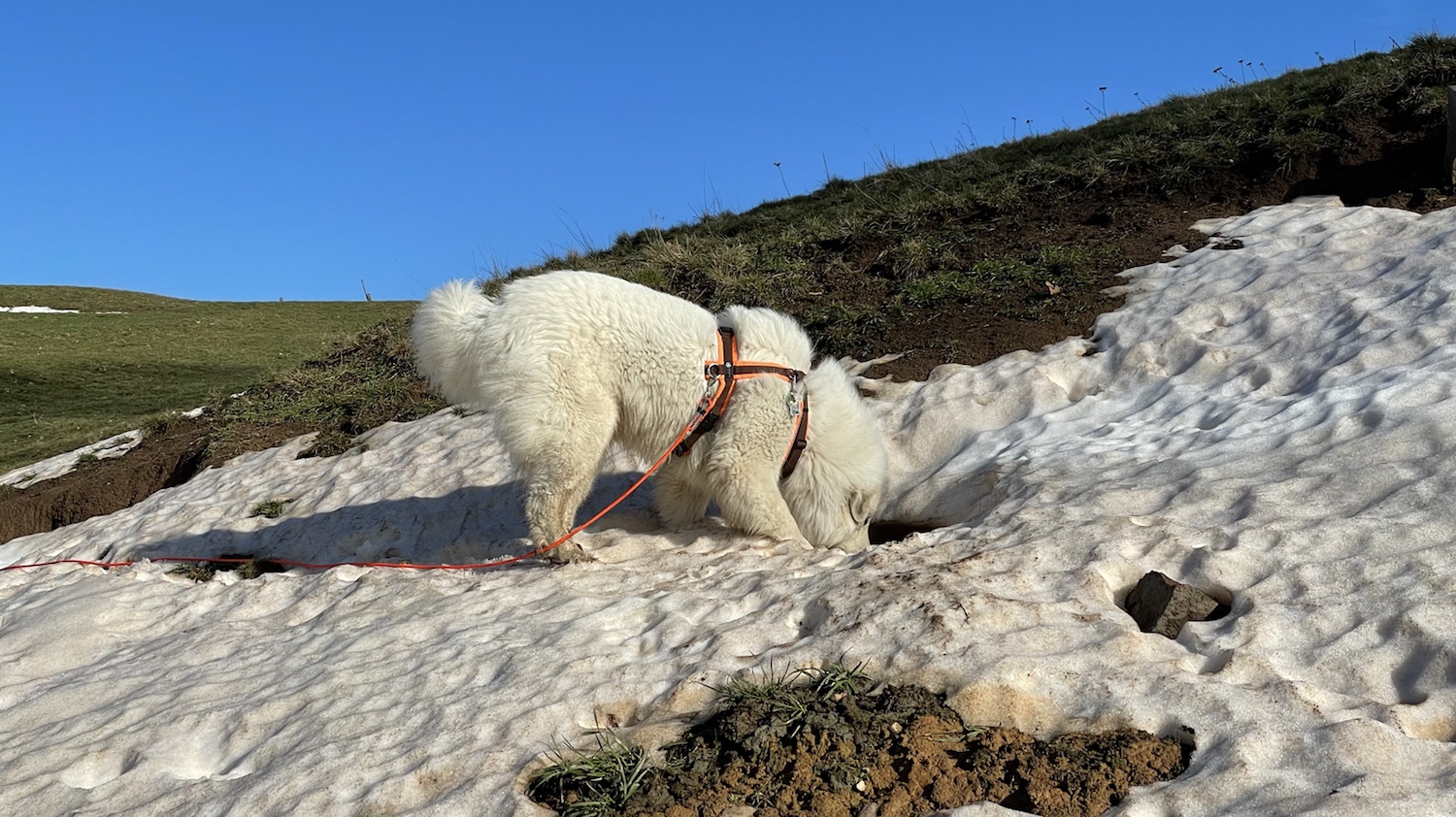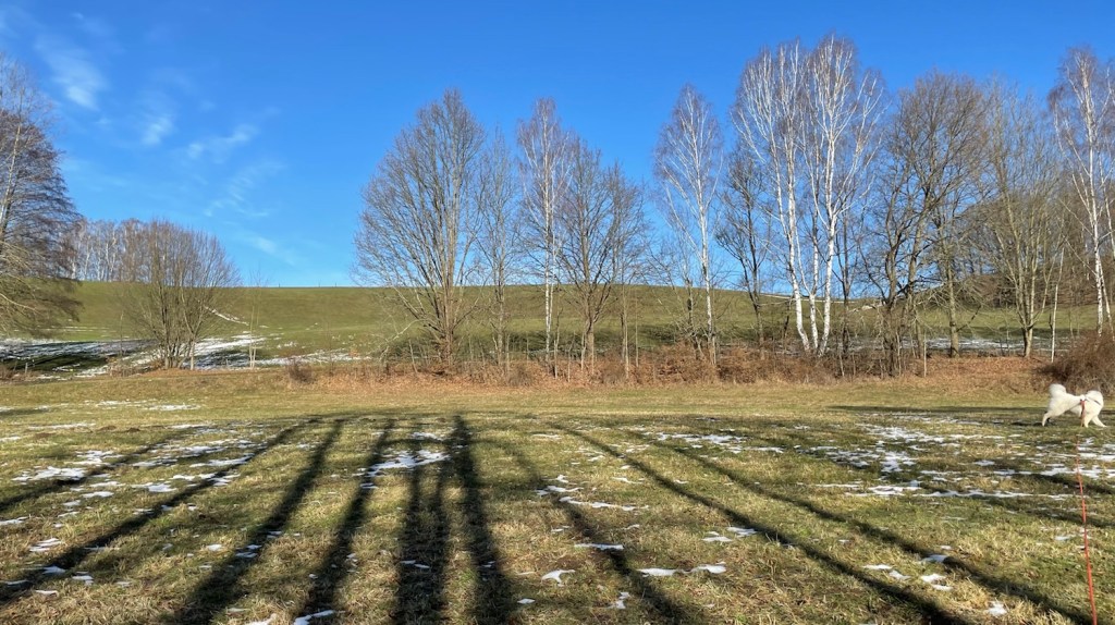 Mit meinem großen Mensch habe ich dann einen Morgenspaziergang gemacht. Wir sind zum großen Feldweg gegangen und dann weiter auf den kleinen Feldweg. Es war gar nicht mehr so viel Matschepampe. Nur noch ein bißchen. Am Fuchsbau habe ich mich nochmal im restlichen Schnee gewälzt. Und dann bin ich wieder über die große Wiese geflitzt. Und mein großer Mensch hinterher.