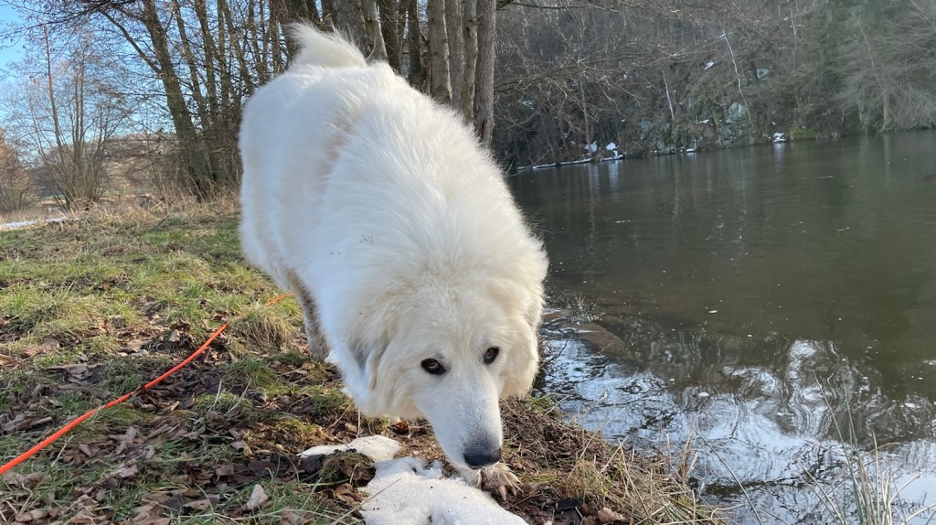 Und dann habe ich am Ufer geschnuffelt. Und da bin ich auch in den großen Fluß rein. Obwohl mich mein großer Mensch immer zurückgerufen hat. Aber ich wollte nicht hörchen. Manchmal will man als Pyri einfach nicht hörchen. Doch, man sagt hörchen. Die Bella sagt hörchen. Und da hat mein großer Mensch geschimpft. Und ich hatte auch ganz dunkelweiße Pyripfötchen. Stinkepfötchen auch noch. Gar nicht schön.