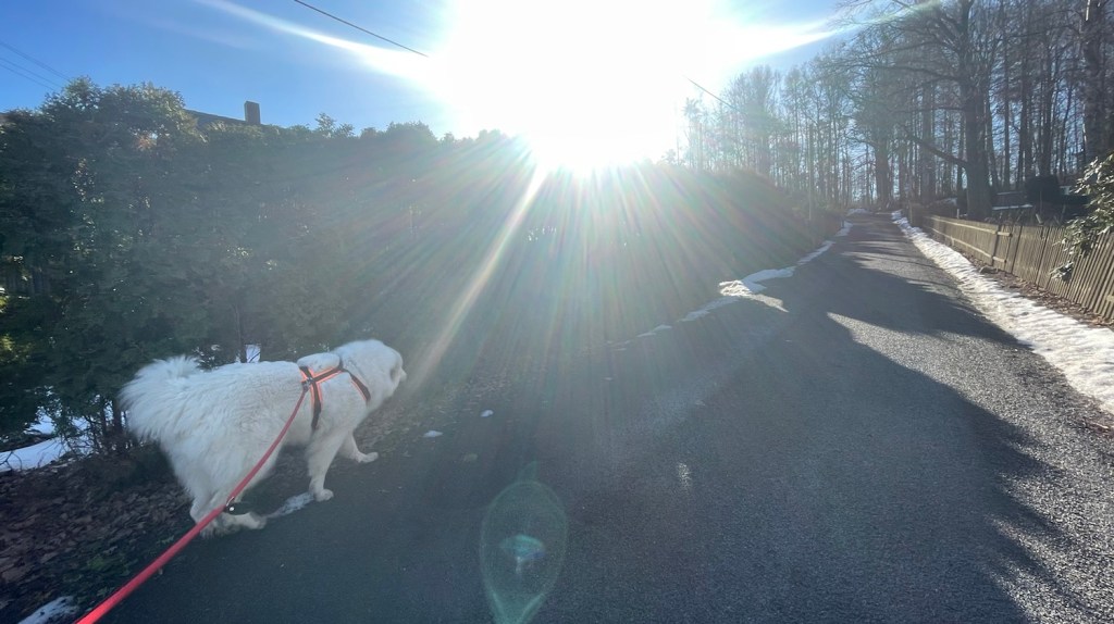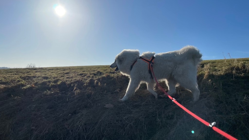 Meine liebe Sonne war auch schon da. Und die ist heute wieder den ganzen Tag bei ihrer Freundin, der Bella, geblieben. Und dann habe ich mit meinem großen Mensch einen Spaziergang gemacht. Sonntagsspaziergang! Der ist wichtig. Sonntags macht man einen Sonntagsspaziergang.