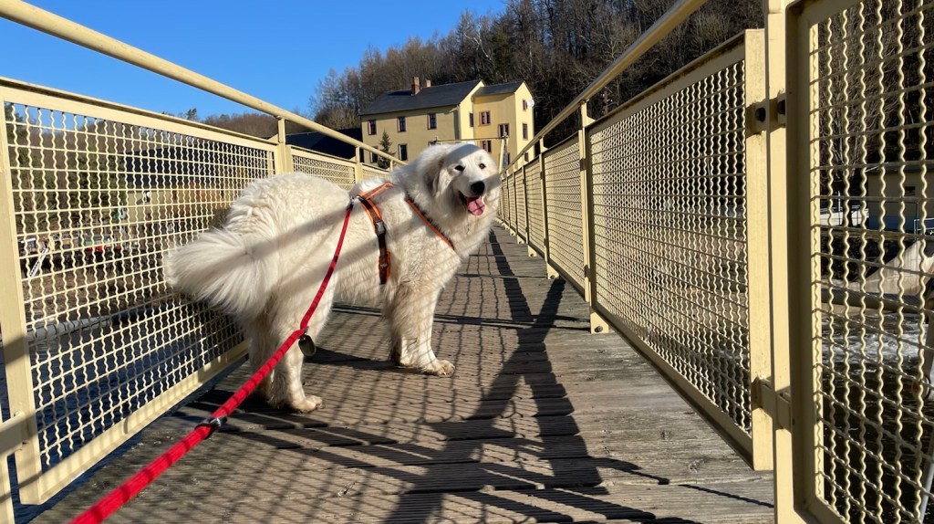 Wir sind wieder den großen Feldweg lang nach Kockisch gelaufen. Ich war wieder ganz lieb. Auf dem großen Feldweg war wieder Matschepampe. Mit meinem großen Mensch bin ich dann über die Wackelbrücke gegangen. Über den großen Fluß mit dem komischen Namen.