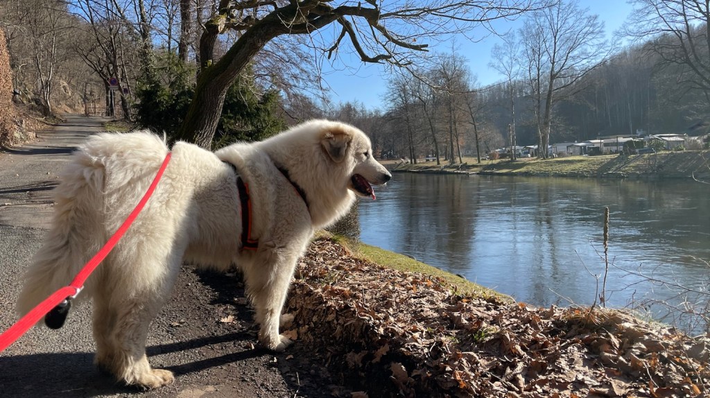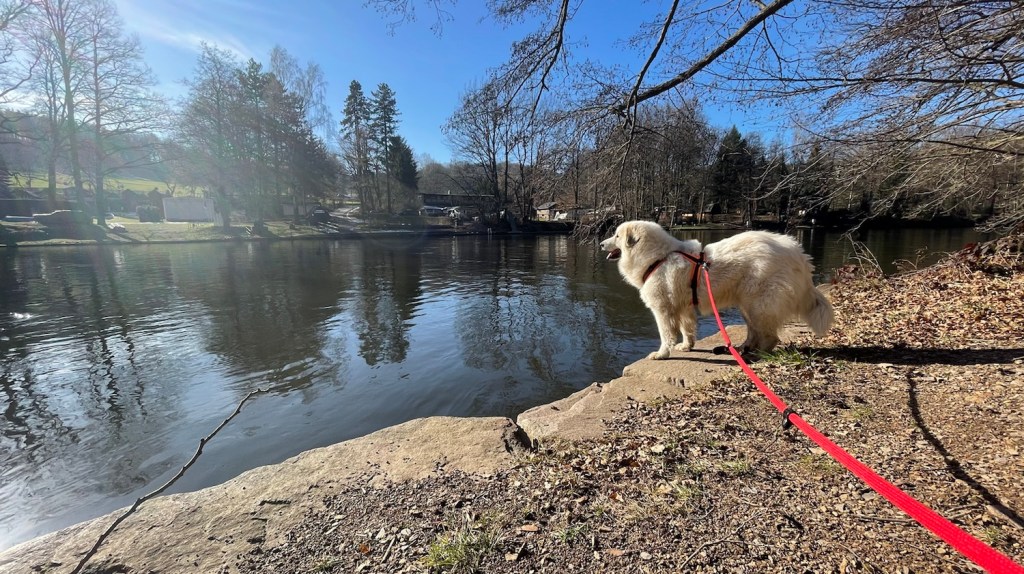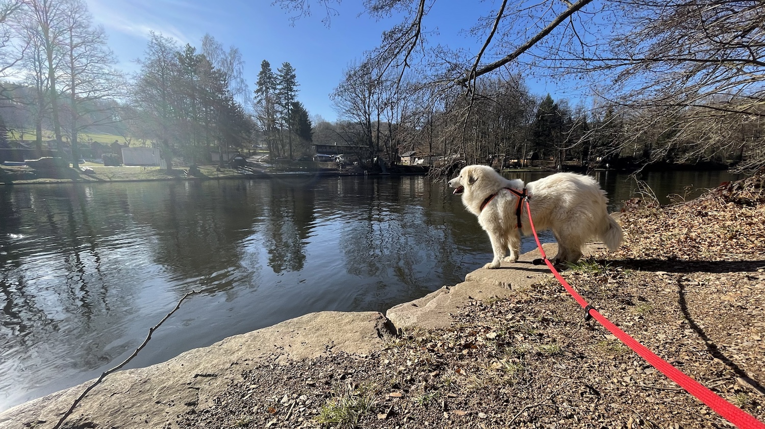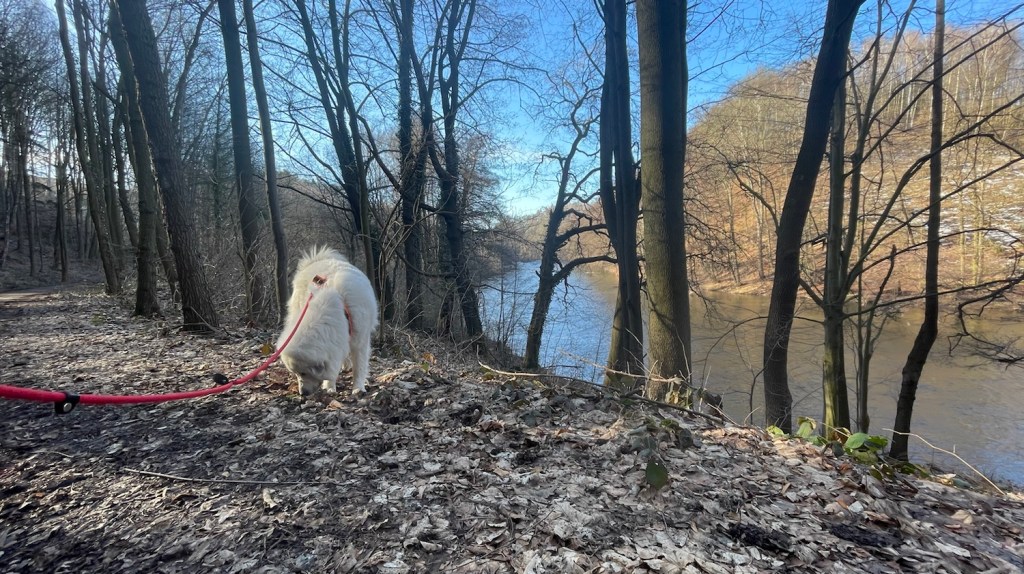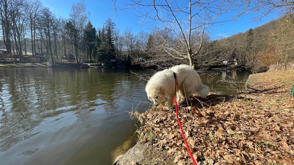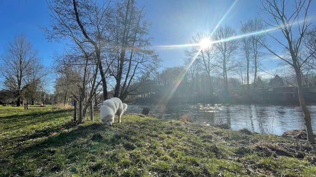 Dann sind wir an den großen Fluß gegangen. Da war es auch ganz schön. Und wir haben heute überall Menschen getroffen. Und als ich so den Fluß langgeschlendert bin ist uns gleich nochmal ein Hund entgegen gekommen. Ich war auch wieder ganz ruhig.