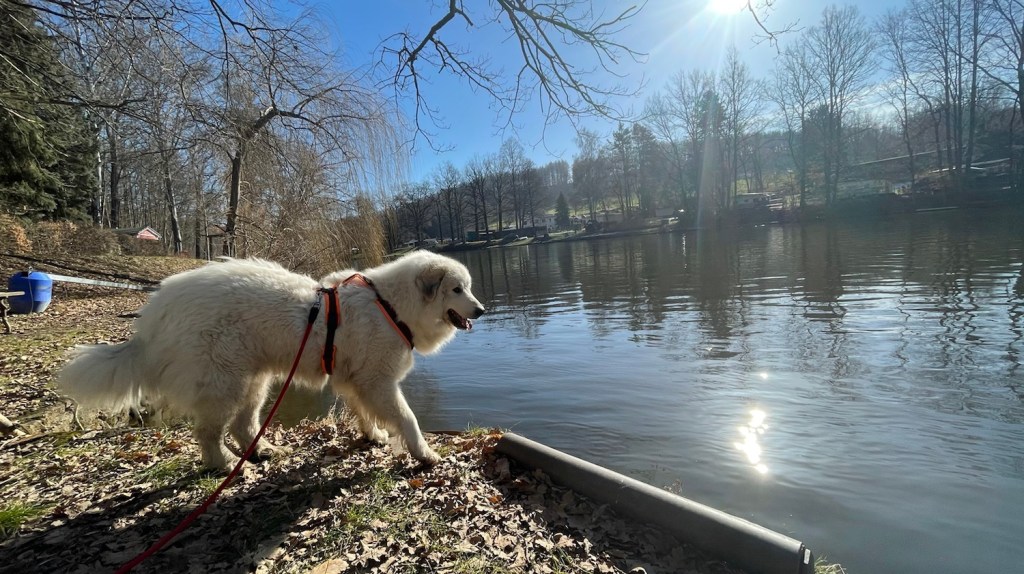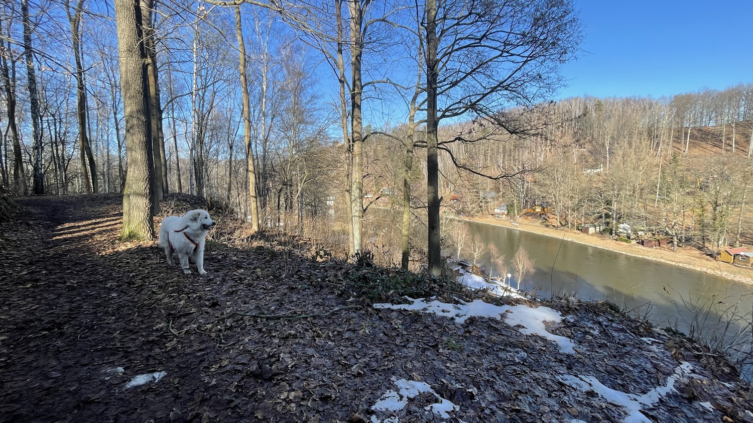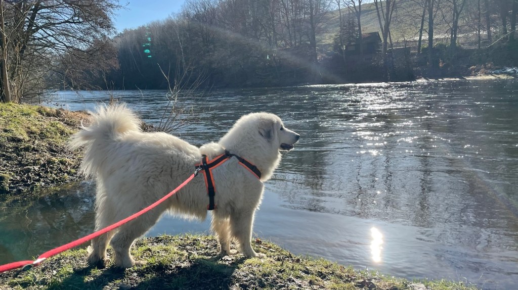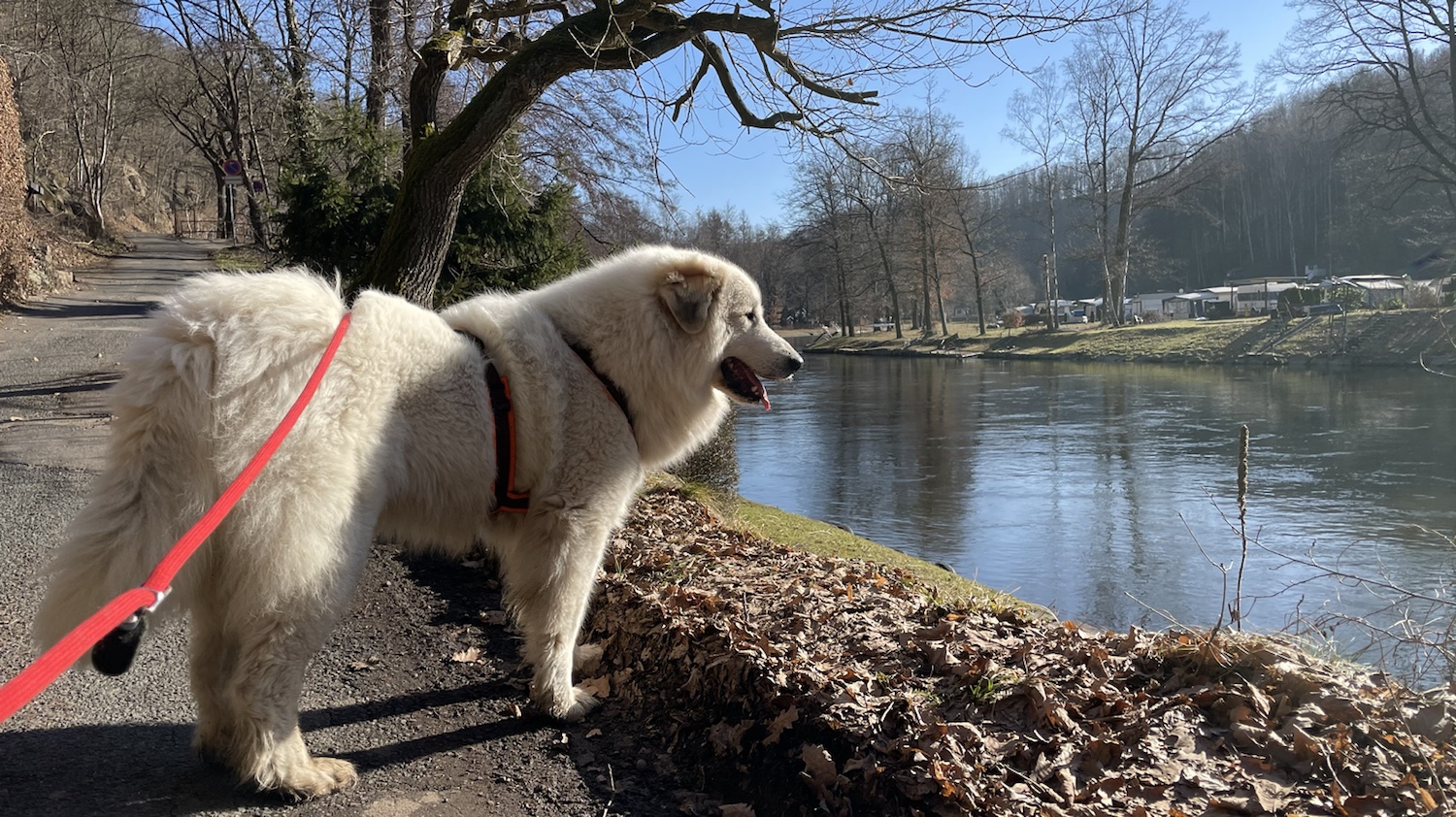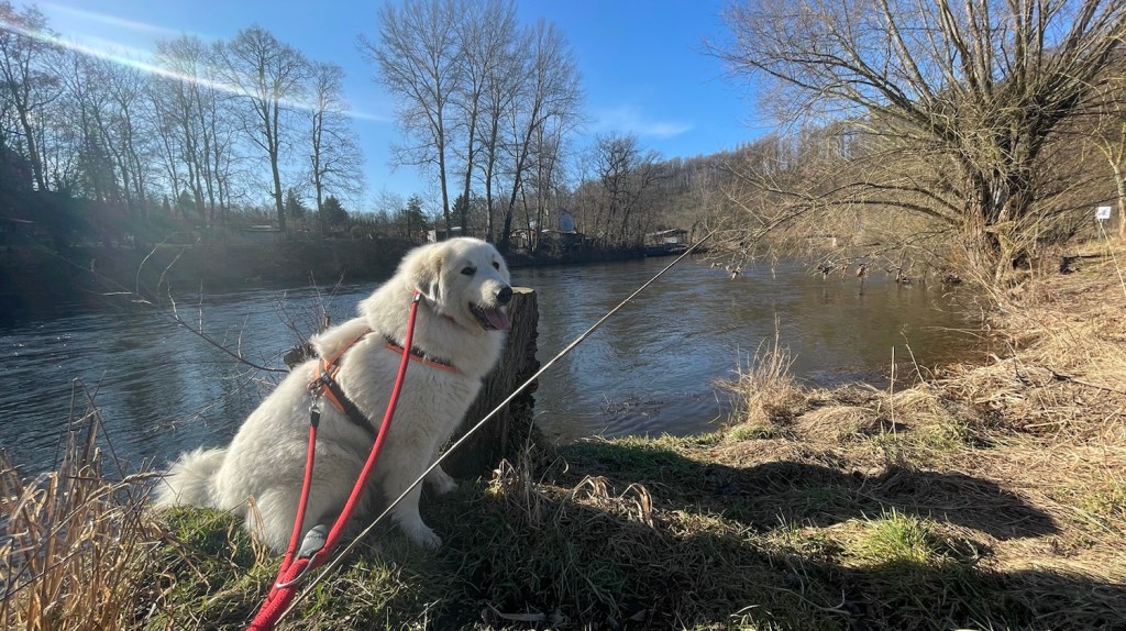Dann sind wir an den großen Fluß gegangen. Da war es auch ganz schön. Und wir haben heute überall Menschen getroffen. Und als ich so den Fluß langgeschlendert bin ist uns gleich nochmal ein Hund entgegen gekommen. Ich war auch wieder ganz ruhig.