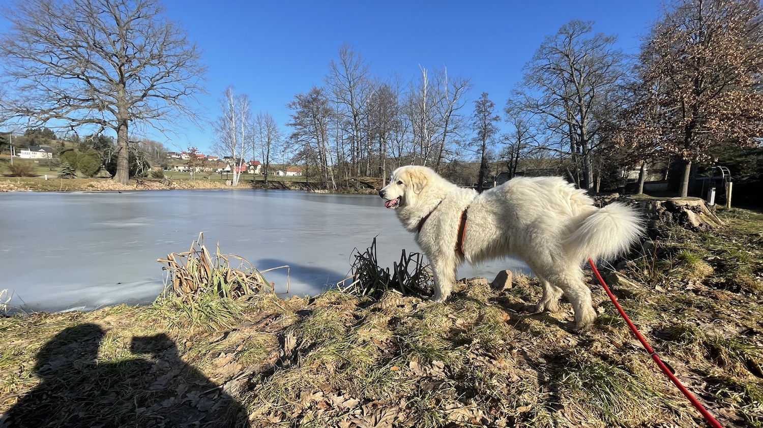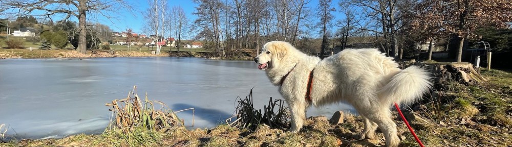 Dann sind wir den Wanderweg immer am großen Fluß lang gegangen. Bis an die Straße. Da haben wir einen Hund getroffen. Aber ich war ganz ruhig. Und wir sind weiter an den großen Teich gegangen. Der ist ganz sehr schön. Inselteich heißt der. Sagt mein großer Mensch. Inselteich, mit einer kleinen Insel in der Mitte.