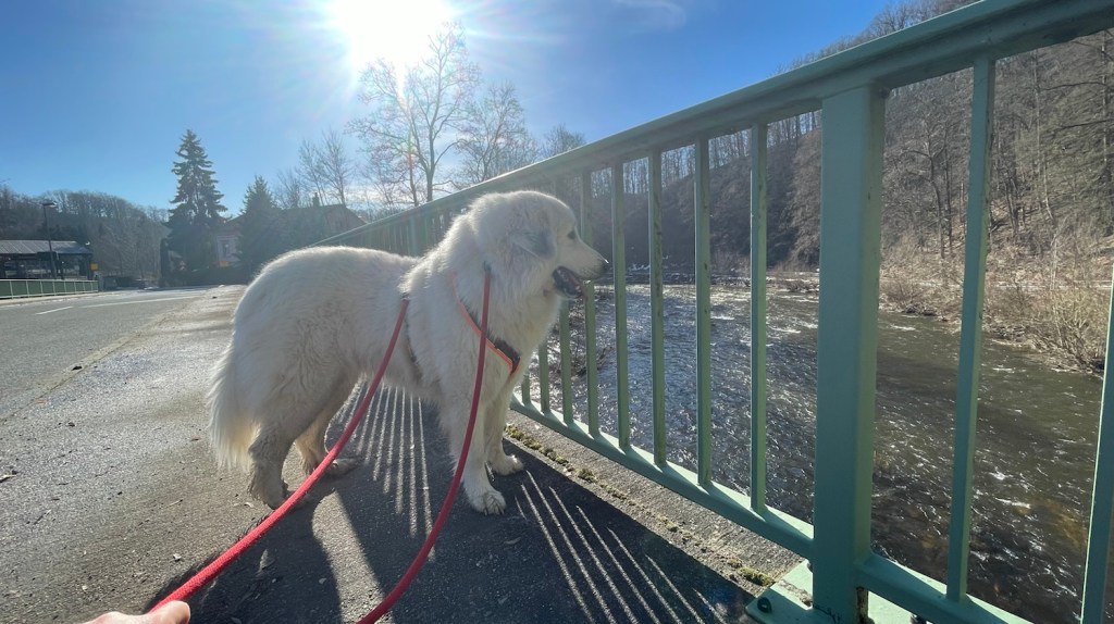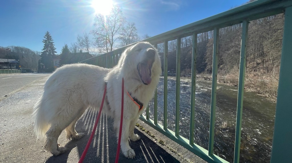 Und wir haben auch wieder viele Menschen getroffen. Und ich war ganz lieb. Und schnuffeln durfte ich auch wieder überall. Ganz in Ruhe. Dann sind wir wieder am großen Fluß gewesen. Da war es ganz schön und ich habe getrunken. Und geguckt. Über den großen Fluß. Auf die andere Seite. Da bin ich gestern gewesen. Auf der anderen Seite vom großen Fluß.