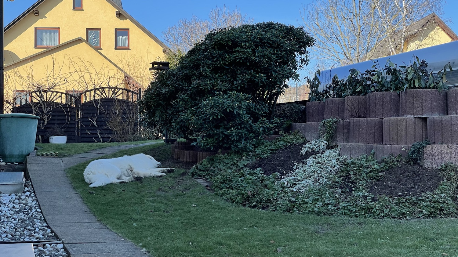 Zu Hause habe ich mich in meinem Garten gleich hingelegt und meinen Pyriprinzessinnenschönheitsschlaf gemacht. Das war ein anstrengender Spaziergang für eine kleine Pyri wie mich. Mein großer Mensch sagt, 9 km sind wir gewandert. Jaaaaa, aber ich habe vier Pyripfötchen. Also, 4 mal 9 Kilometerns sind 36 Kilometerns, also aufgerundet ungefähr ziemlich fast ganz genau hundertundmillionentausend. Und das ist ganz schön viel. Jawoll!