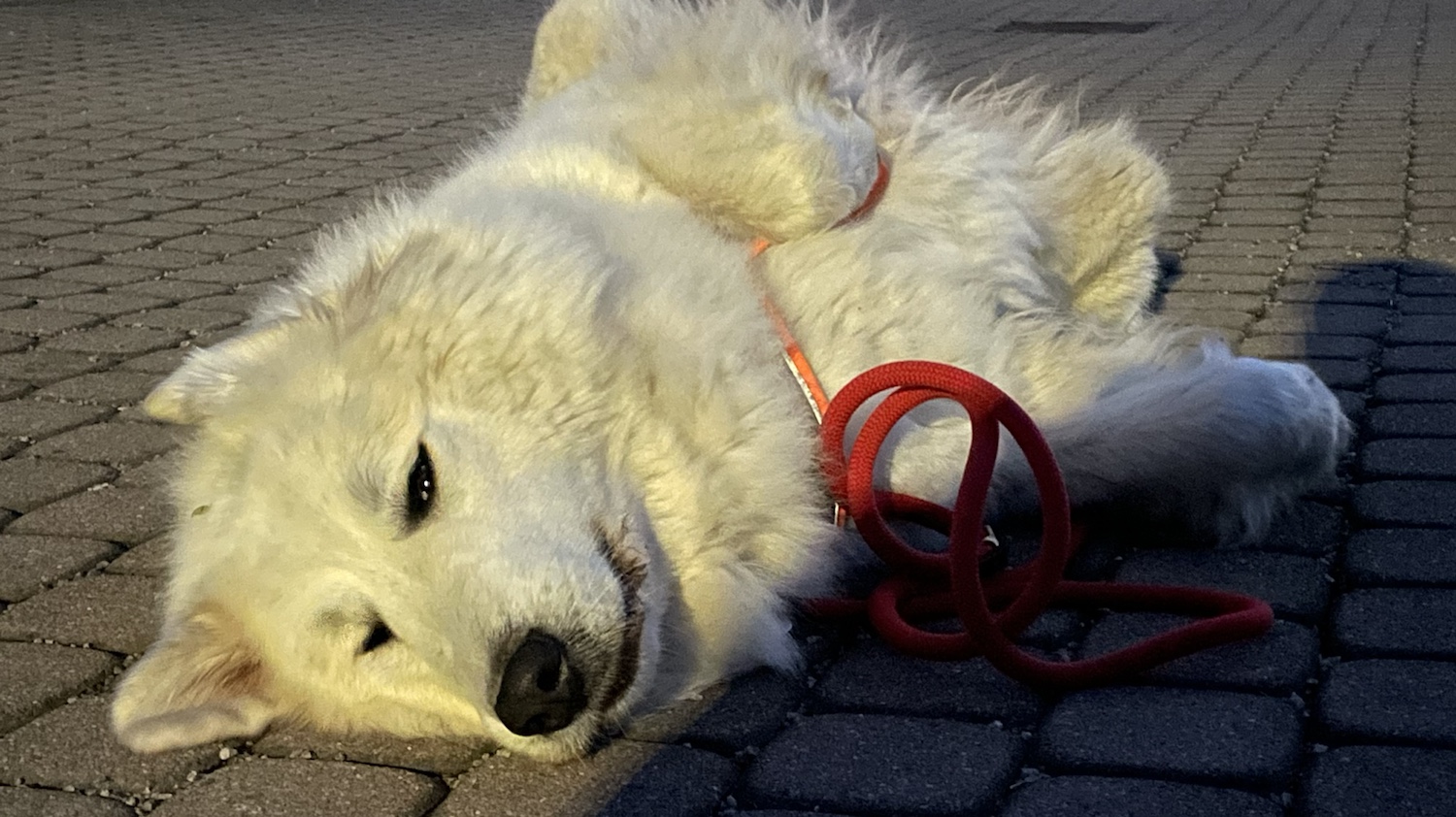 Und dann haben wir noch unseren Abendspaziergang gemacht. Mein großer Mensch und ich. Durch mein Wohngebiet. Eine große Runde. Und auf dem Heimweg hat mein großer Mensch jemanden getroffen und da haben wir eine Pause gemacht. Und die Bella war ganz brav. Und ich habe noch fein ein Picknick gemacht. Und dann wollte ich noch kuscheln. Da habe ich es mir auf der Straße gemütlich gemacht. Mein großer Mensch mußte mich da kraulen. Pyribäuchlein kraulen. Das ist schön.