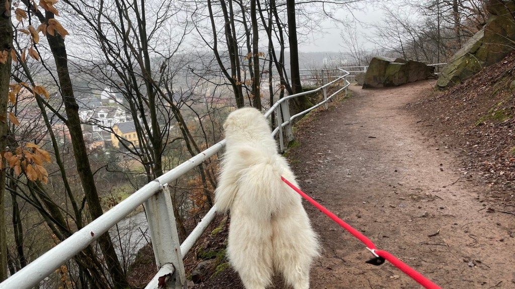 Ich bin dann mit meinem großen Mensch weiter zum großen Rad-Wander-Weg und immer am großen Fluß mit dem komischen Namen lang gewandert. Und da habe ich auch wieder schön geschnuffelt. Mein großer Mensch wollte eigentlich beim Spike vorbei die Straße zurücklaufen, aber ich wollte lieber noch zur großen Wiese. Und da sind wir dann auch hingegangen.