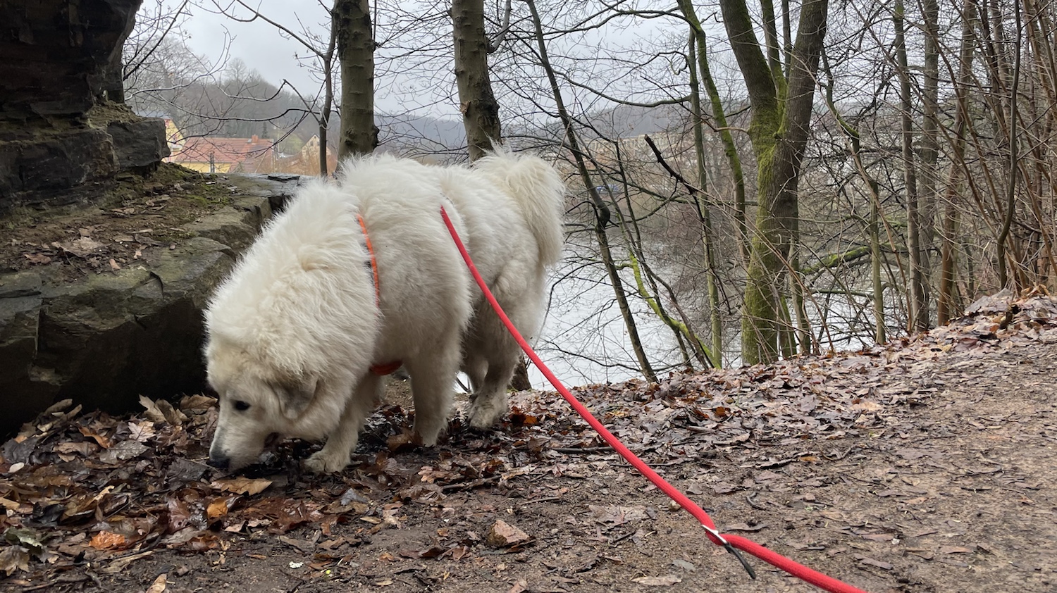 Ich bin mit meinem großen Mensch die große Wiese hochgelaufen und wir sind noch schön gemütlich über die Rehwiese geschlendert. Ich durfte auch aus den kleinen Miniteichen auf der Wiese trinken, weiiil, da war Regenwasser drin. Ganz sauberes.