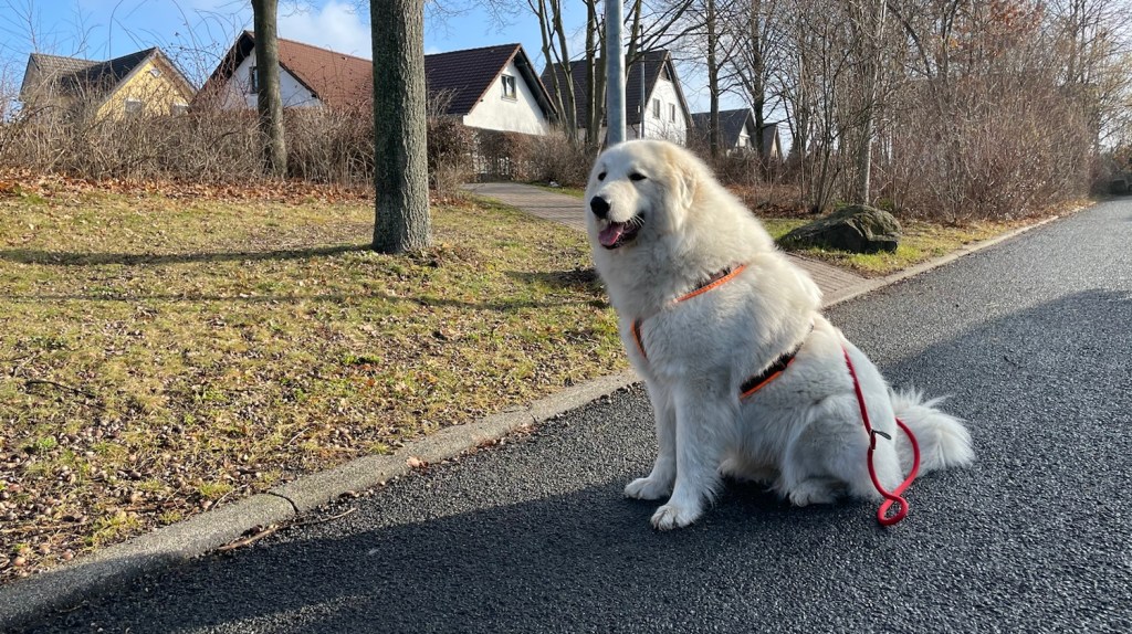 In der Siedlung habe ich dann noch den Aaron getroffen. Das ist ein weißer Hund. Also dunkelweiß. Ganz dunkelweiß. Mein großer Mensch sagt, der Aaron ist schwarz. Auf jeden Fall ein Junge. Der war in seinem Garten. Da wollte ich auch hin. Spielen. Die Bella spielt gerne mit Jungs. Die zicken nicht. Aber um den Garten ist ein Zaun. Wie bei meinem Garten. Und da bin ich dann eben mit meinem großen Mensch durch mein Wohngebiet nach Hause gegangen.